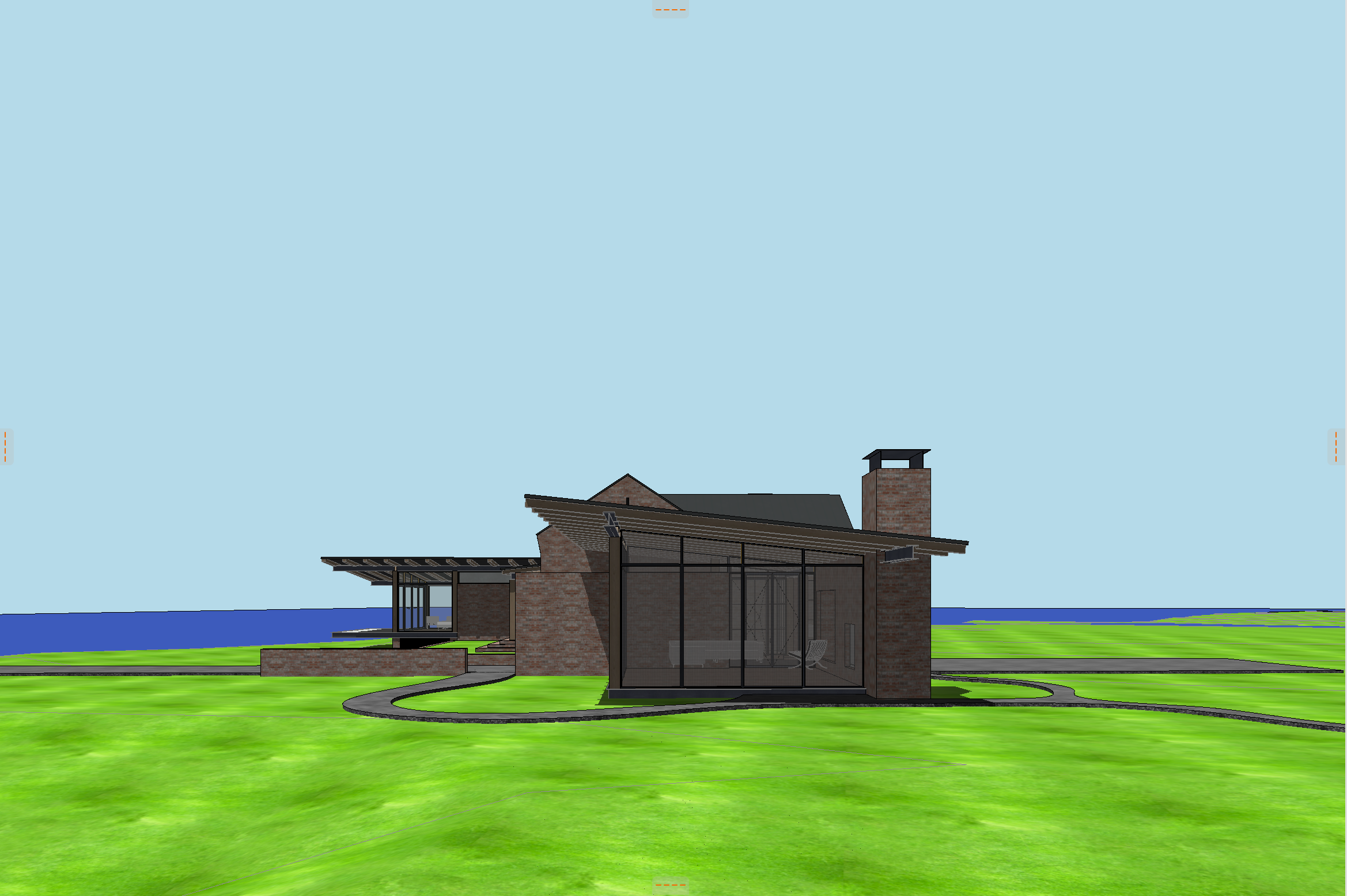 antique brick house with timber columns steel beams glass windows reclaimed pine soffit and a standing seam roof wild lousiana grasses and vibrant wildflowers all the way to house yellow pine trees in the background lake in the distance clouds in the sky all glass should be reflective so that in the interior of the house is not visible