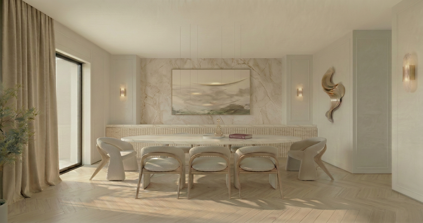 make marble tiles lightly glossy but not too much make joints between tiles above washbasin is 2 pieces of mirror in mirror make visible opposite wall of bathroom with vertical radiator add spotlights on ceiling in some raster sliding doors are from dark glass with black frame the floor behind door is from herringbone wood tiles and the other room is wall from plaster in light beige microcement make render according origin picture dont change anyting