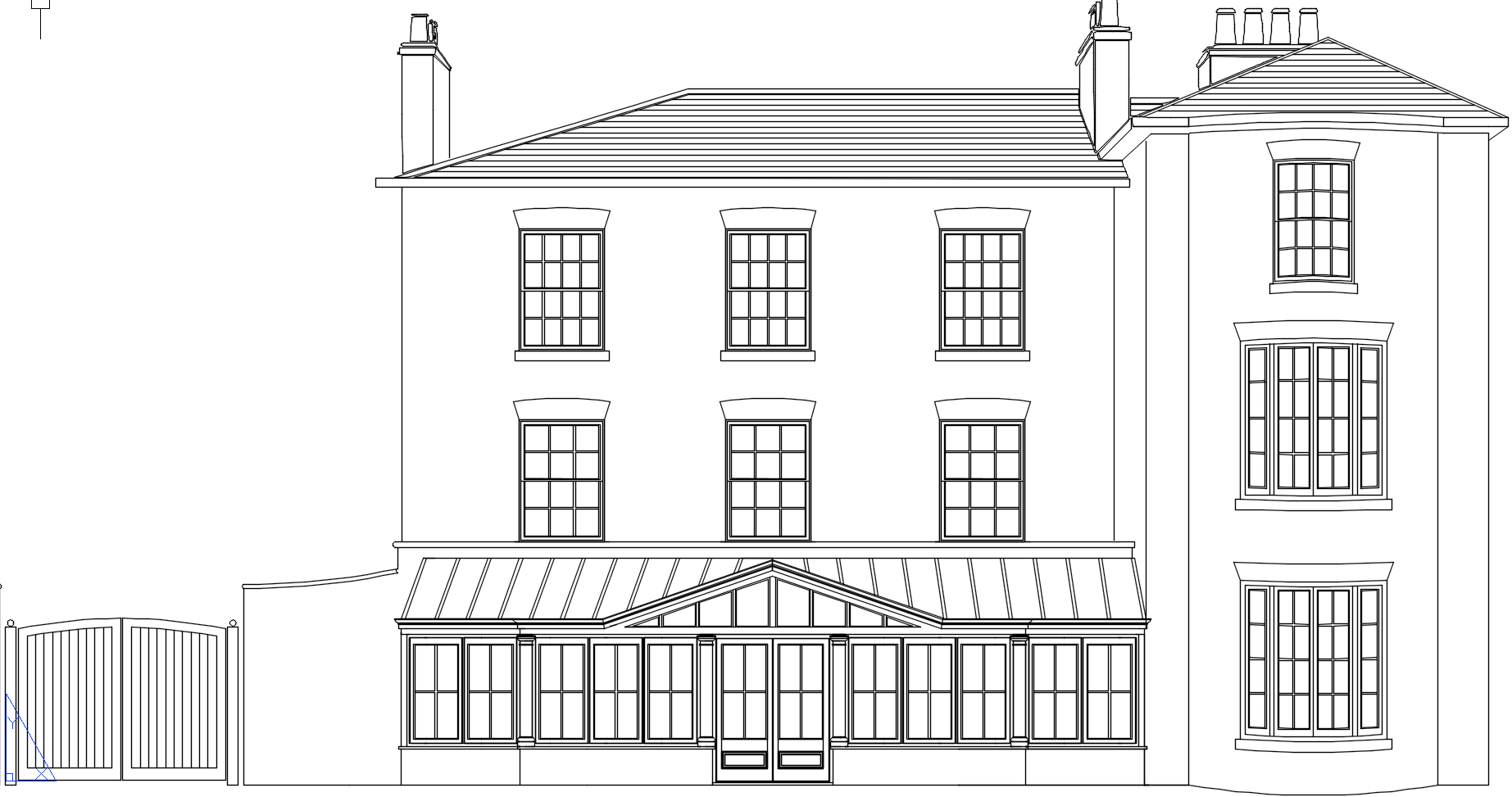 take this drawing which shows rear side side elevations and plan view and make a 3d render the side elevations only show a portion of the house as well as the plan view the building is of victorian edwadian era in the uk its has traditional red brick with lime mortar the windows of the house are white mainly sliding sash but with 2 large casement windows on the right hand side of the house under this windows are stone cills painted white there is no other stone on the property on the right of the house the wall is curved in a semi circle as shown on the plan view above the windows is a brick detail the conservatory has a brick dwarf wall and the rest is painted in farrow and ball elephants breath the cappings holding the glass inplace are lead there is no stone cill on the conservatory to the left of the house is a brick wall with gates fpainted in farrow and ball elephants breath in front on the brick wall is some bushes and shrubbery the roof is slate with leaded hips there is a large overhanging soffit which is finished in cream ral 10 b 15 the house is set in the country with some tall trees in the back ground in front on the house is an indian limestone patio and then grass