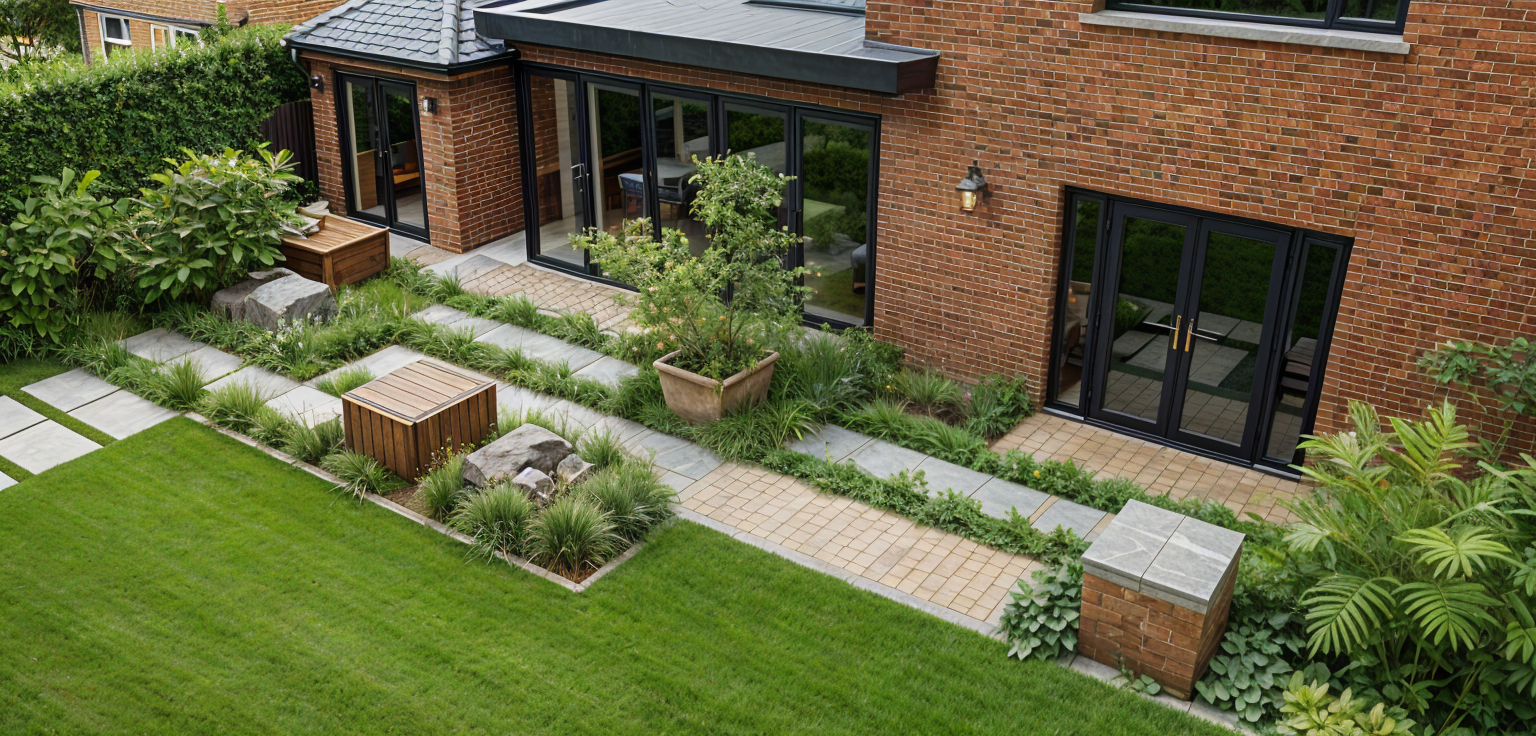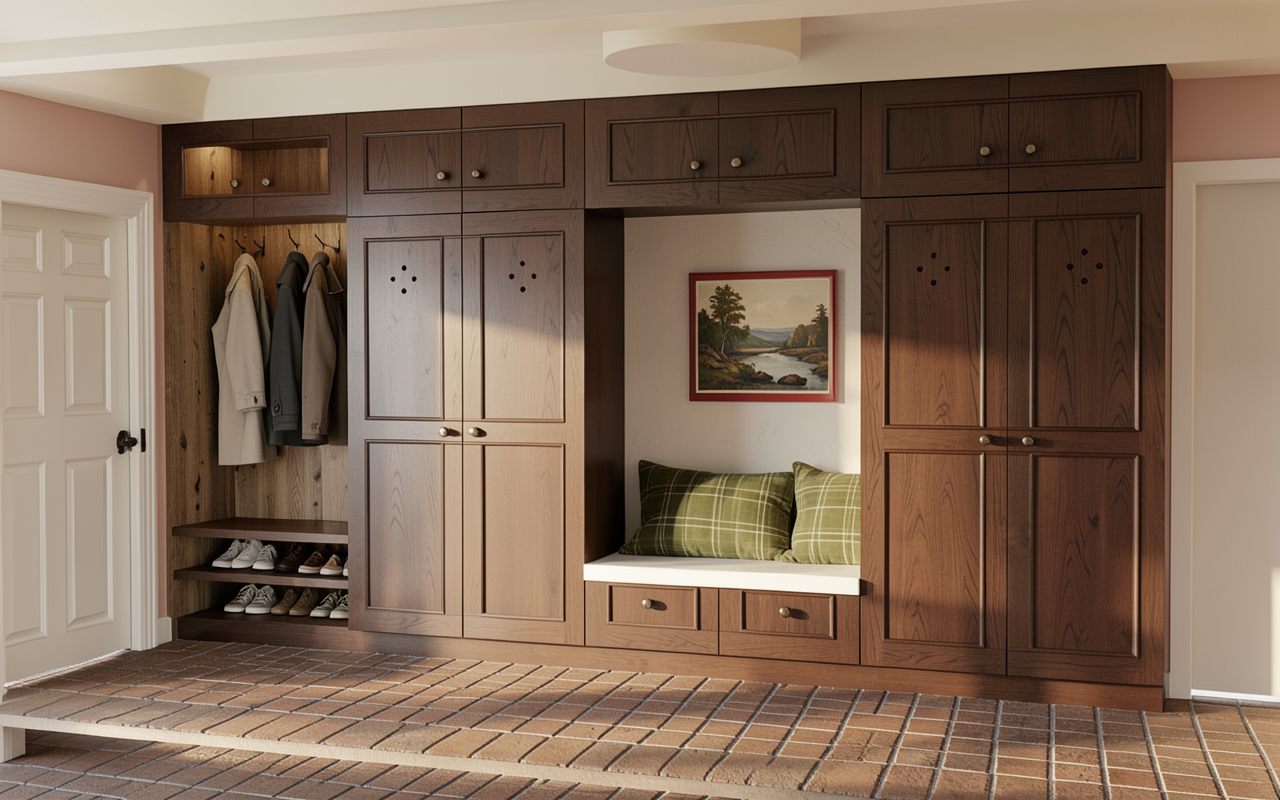 render this with a romantic morning light on it keep all the materials off white cream except the floor can be an outdoor brown brick make the front door on the left a craftsman paneled door but still off white