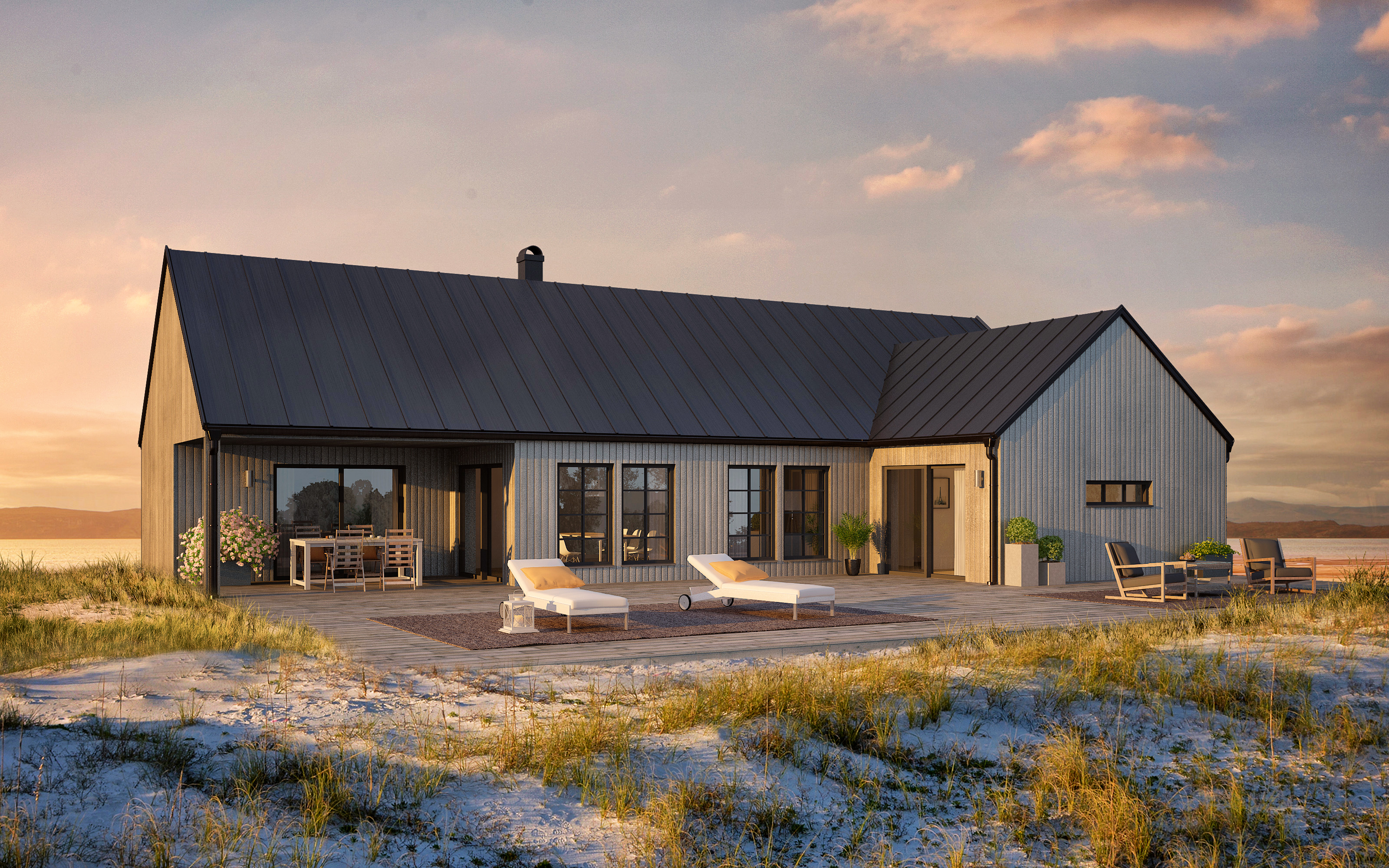 dont change anything about the house just zoom out and add more sky and make the picture standing remove the lake and put the house surranded by trees and remove the sand