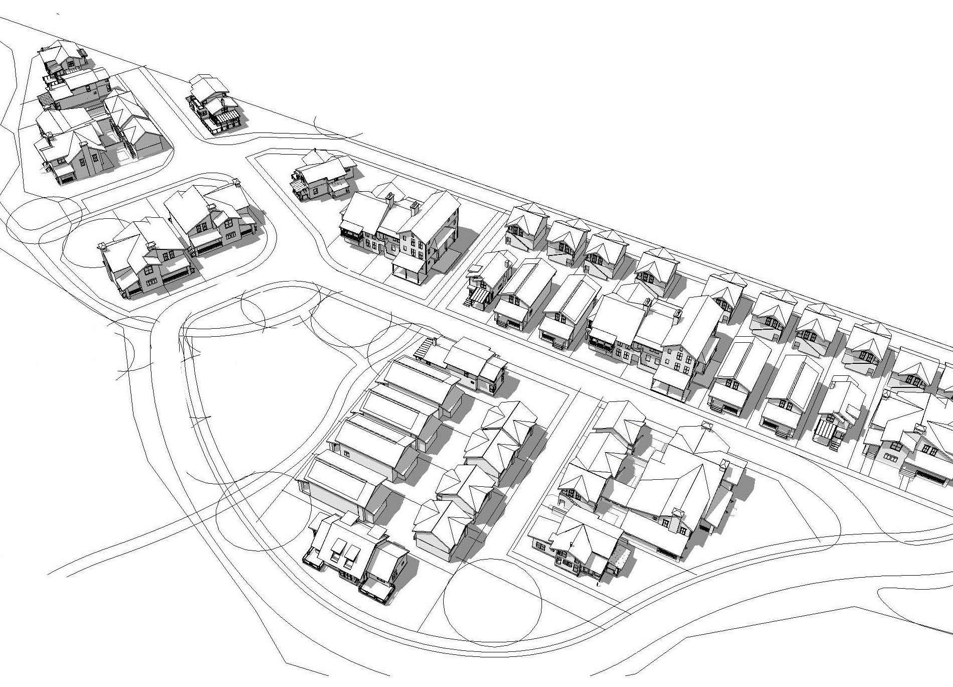 new urbanism aerial shot woodland setting a pocket of colourful wood clad small homes with pathways and metal roofs surrounded by forests near seattle with big trees architecture
