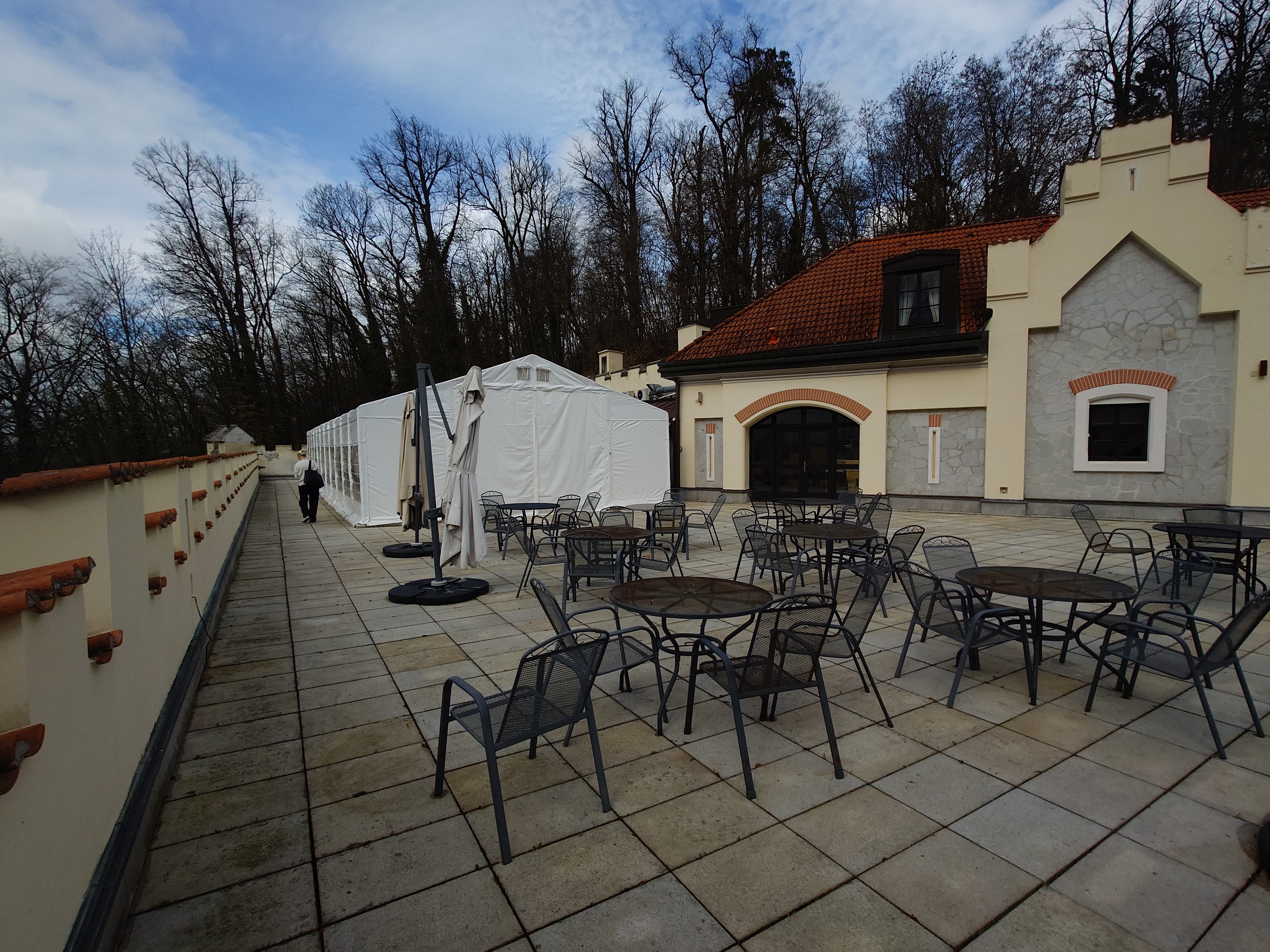 open tent sides put reference interior to tent clear terrace floor make 6 seatings with 4 chairs put in lechuza plantpots with olives around terrace