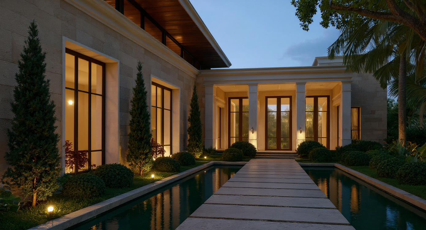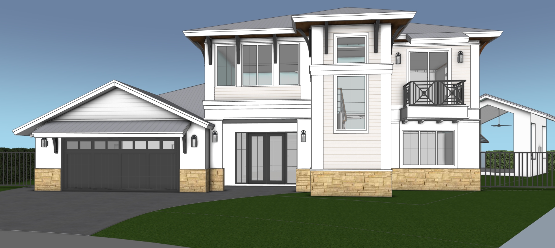 high quality photorealistic image of a west indies style house located in suburban florida with beautiful up scale landscape white walls with white siding accents white windows with mullions and a beautiful silver metal roof with architectural decorative brackets in a dark color to create contrast with the with the white sleek the wainscoting with a natural stone in a neutral color that goes well with the design of the house