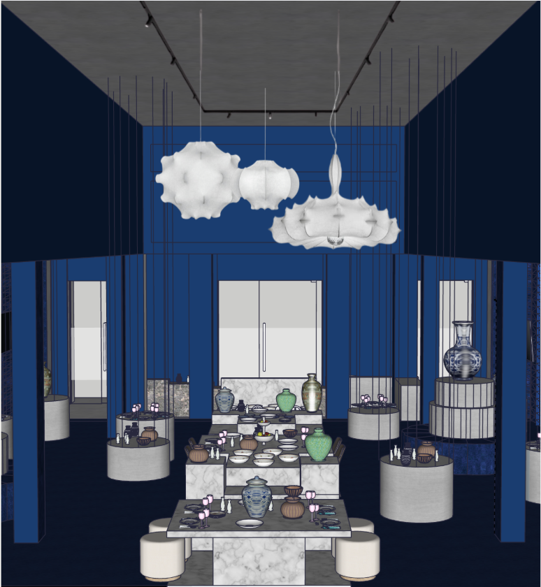 ceramic store with blue carpet pendant lights track ceiling lights glass doors marble central table stainless steel displays
