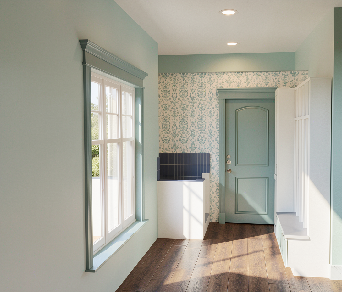 render with 50 midday natural light from window and front porch view render with 25 recessed light wall color is sherwin williams sea salt door and all trim is a dark blue grey wallpaper is as shown