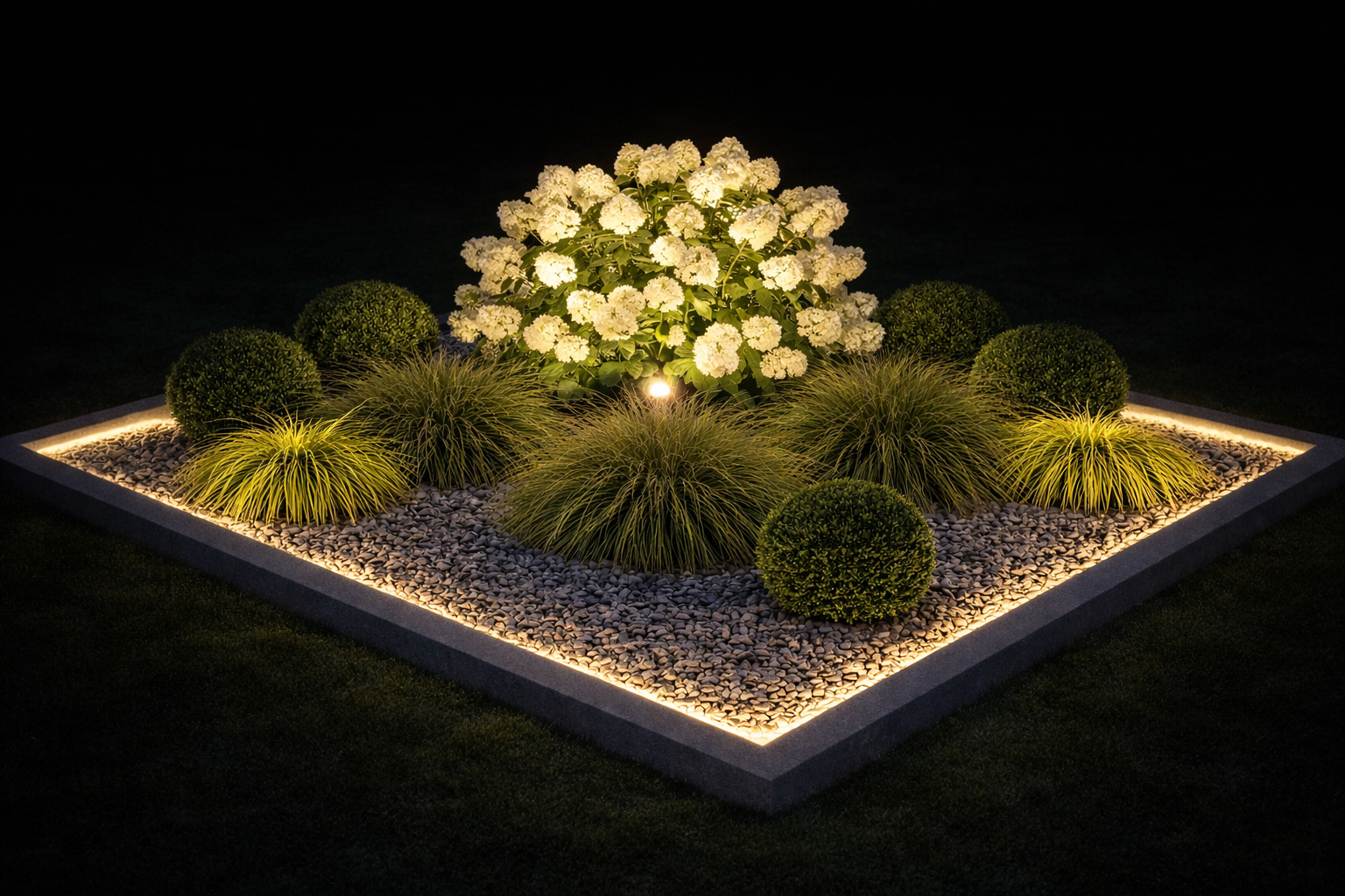 create a serene garden scene featuring a lush landscaped bed bordered by sleek light gray stone edging in the center a large hydrangea bush blooms with delicate white flowers surrounded by perfectly trimmed spherical green boxwoods accent with clusters of wispy ornamental grasses in a spectrum of vibrant greens and yellows fill the ground with smooth dark gray pebbles providing a sleek and modern base convey a calm and tranquil atmosphere with soft lighting to enhance the natural beauty of the garden elements