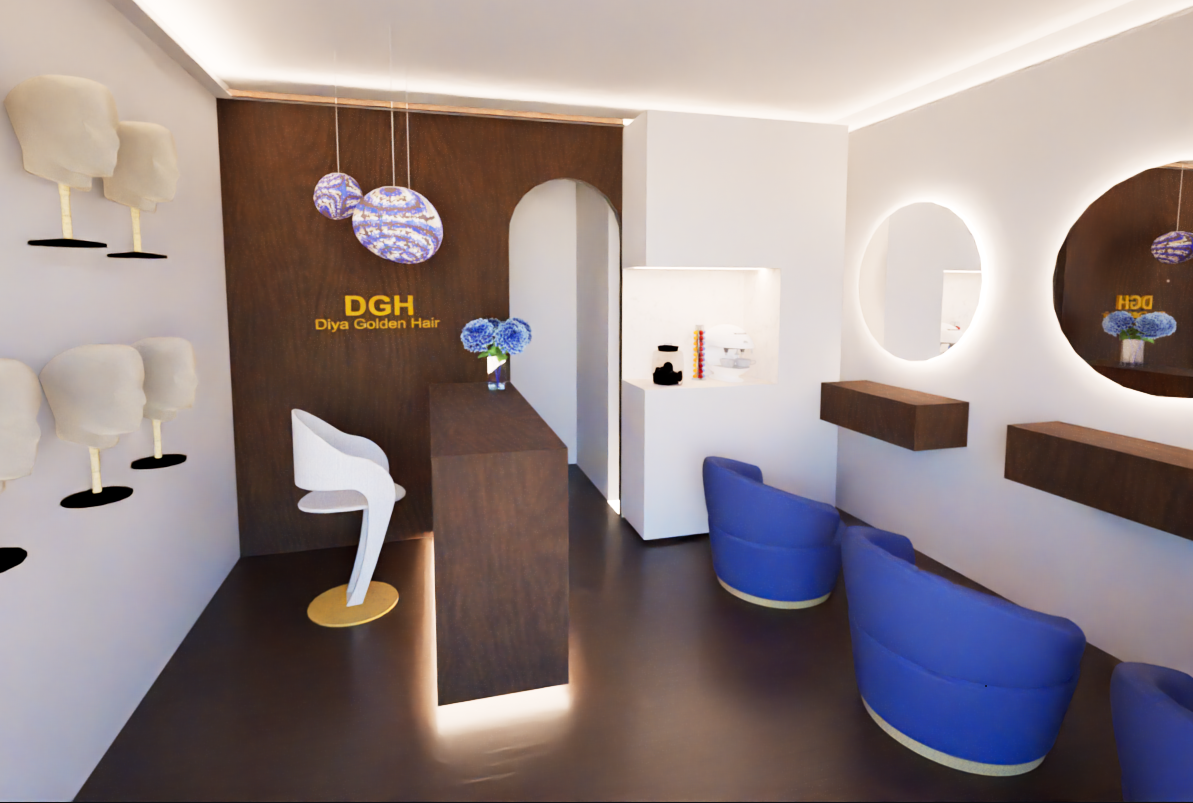 please do a realistic rendering of this luxurious hair salon considering that the white fourniture at the very back is a minimal little white and calacatta marble kitchen