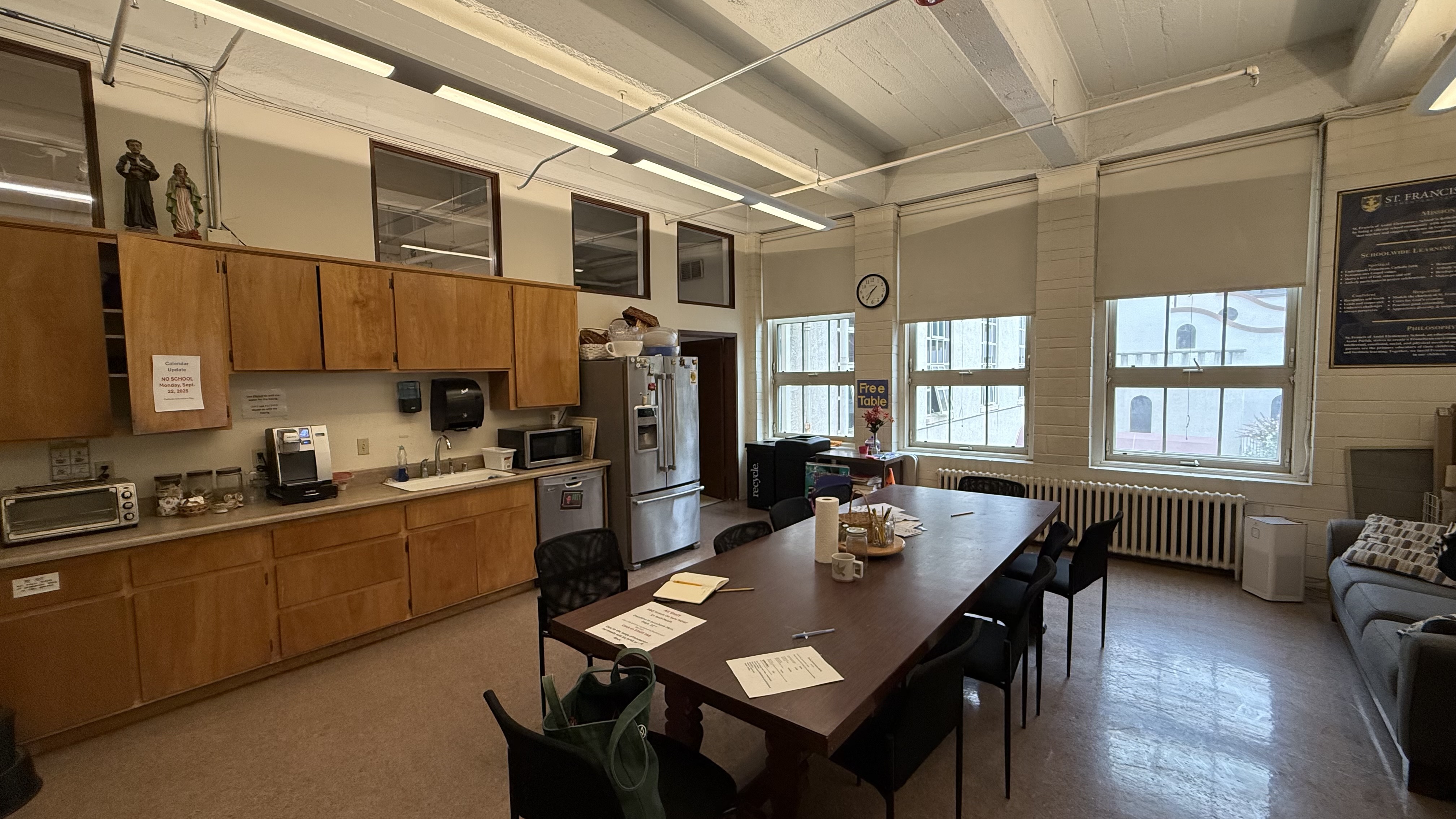 a bright and airy modern teacher lounge featuring warm wooden built in bookshelves filled with books along the left wall in the foreground and mid ground there is one long wooden tables with dark blue cushioned stools the ceiling is high with visible beams track lighting and ceiling fans the flooring is a neutral toned carpet the overall atmosphere is inviting and conducive to study or quiet reading architecture