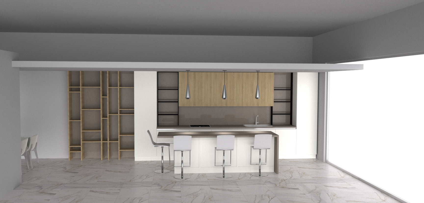 render a modern kitchen interior with a sleek minimalist design feature a light gray ceiling and walls with bright white cabinets highlight the warm wooden tones of natural oak for the shelves and upper cabinets use a polished light beige marble texture for the flooring infused with subtle gold veining include modern pendant lights with metallic silver finishes create a bright inviting atmosphere with ample natural light flooding in from large windows on one side add three contemporary white bar stools with chrome bases emphasize clean lines and an airy spacious feel throughout open metal shelves left and right elegant and discreet decorative elements