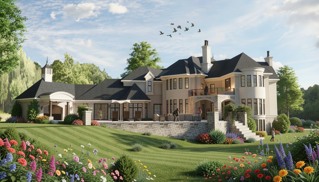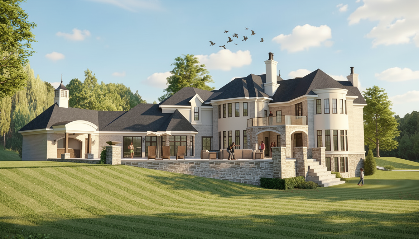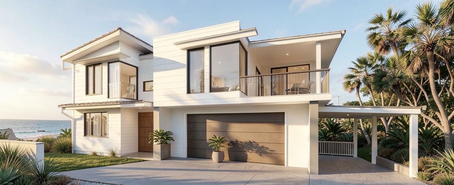 render a sleek ultra modern bathroom with concrete tile floors white walls and ceiling white bathtub plumbing fixtures including tub filler shower controls hand shower and shower heads to be a soft champagne finish the shower to have a soft white onyx walls that are backlit shower bench also the be white onyx clerestory windows with balck frames that let natural light in doors are greige cabinets are dark grey wood with light concrete counters with high backsplash and pencil greige backsplash on back and left wall through window you can see white splitface stone