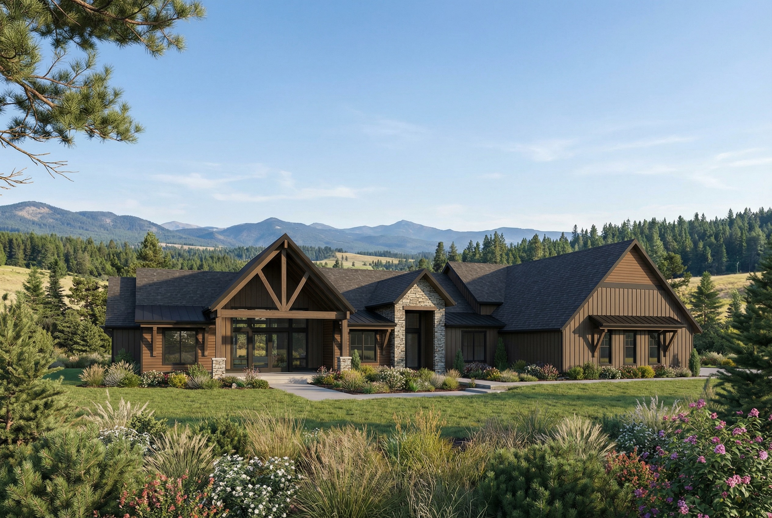 do not change anything keep photo exactly the same except change the color of only the horizontal siding to darker texture rgb 69 54 35 and lighter texture rgb 156 132 106 the color and texture is elkhorn by diamond kote siding products