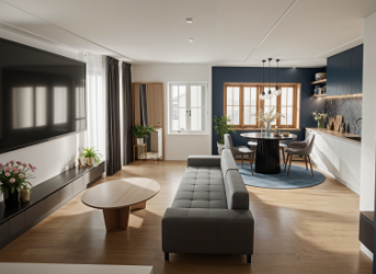 modern family apartment interior filled with natural daylight warm and inviting atmosphere the 3d visualization must exactly match the provided drawing identical layout proportions furniture placement and spatial relationships central dining area with a large black chandelier above the table as a strong focal point round black dining table minimalist sofa with subtle gray details with a mirror positioned directly behind the sofa kitchen seating aligned with the dining table height with a platform made of white matte wood kitchen design features upper cabinets in blue and lower cabinets in white matching the white matte wood seating platform interior enriched with plants and flowers for freshness add a monochromatic rug under the round dining table in the living room and a matching monochromatic rug under the kitchen seating area if the rug is blue it must be a muted desaturated tone not bright or vivid the interior color palette is strictly limited to wood black blue and white tones only romantic ambient lighting soft warm atmosphere high quality materials realistic textures clean modern aesthetic balanced composition keep the original model completely unchanged do not modify geometry layout furniture placement or proportions in any way the 3d result must be fully identical to the drawing with only materials colors textures and lighting adjusted photorealistic interior render high detail global illumination soft natural daylight subtle shadows