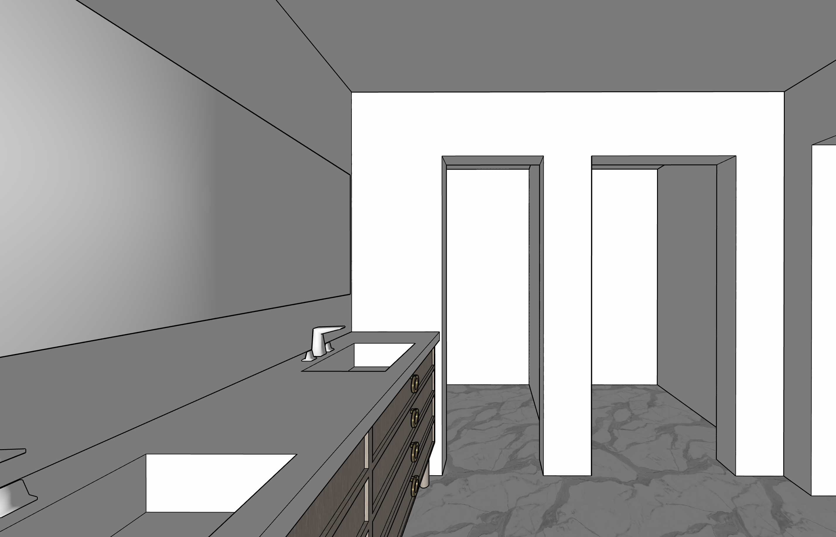 a luxurious modern bathroom with a serene and elegant atmosphere the walls are painted in soft white tones complemented by white trims and edges the floor is a sophisticated marble with a mix of light and dark gray veins that reflects light with subtle sheen the double vanity is crafted from light wood with brass drawer handles topped with a pristine white countertop the large frameless mirror above reflects ambient light enhancing the room s spacious feel natural light to flow in creating a bright and airy atmosphere sauna in the right back room and laundry in the back room left