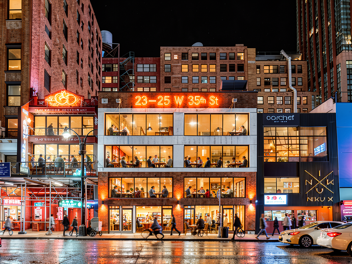 keep the entire image unchanged preserve the exact composition lighting materials perspective people and atmosphere of the nighttime nyc street scene only modify the existing neon signage on the building facade replace the current neon text with ktown 2 0 23 25 w 35th st ensure the new text matches the original neon style warm white orange glow maintains the same size placement alignment and proportions keeps realistic neon tube detailing and light bloom integrates naturally with the facade lighting and reflections does not alter surrounding brick windows or interior views photorealistic result seamless edit no other changes