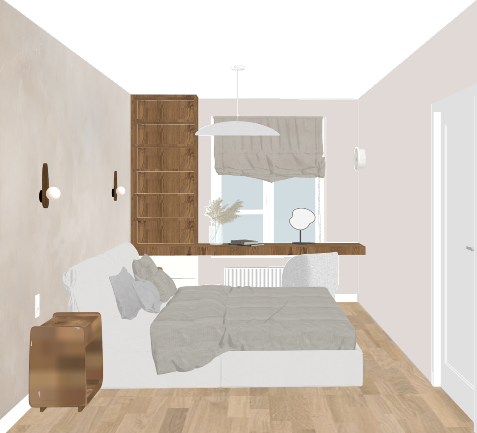 white ceiling only left wall with stucture front and right wall light beige smooth natural wood on a floor side table by the bed wooden not too dark wood