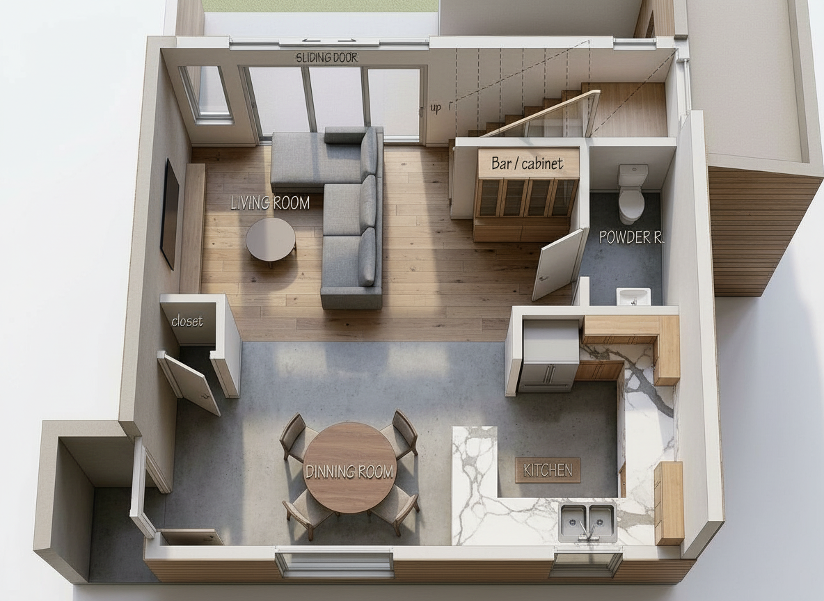convert this floor plan into a realistic isometric 3d view of a full house show the space from an elevated angle with furniture walls and details visible move the sofa slightly away from the sliding door to improve circulation apply wood flooring consistently throughout the entire space add realistic textures to all surfaces including a white marble countertop in the kitchen with natural veining and physically accurate reflections remove the window next to the sliding door remove the window above the stove do not modify the layout wall positions door locations or any other architectural elements beyond the changes specified use the same furniture as shows on the plan do not change the orientation of the floorplan