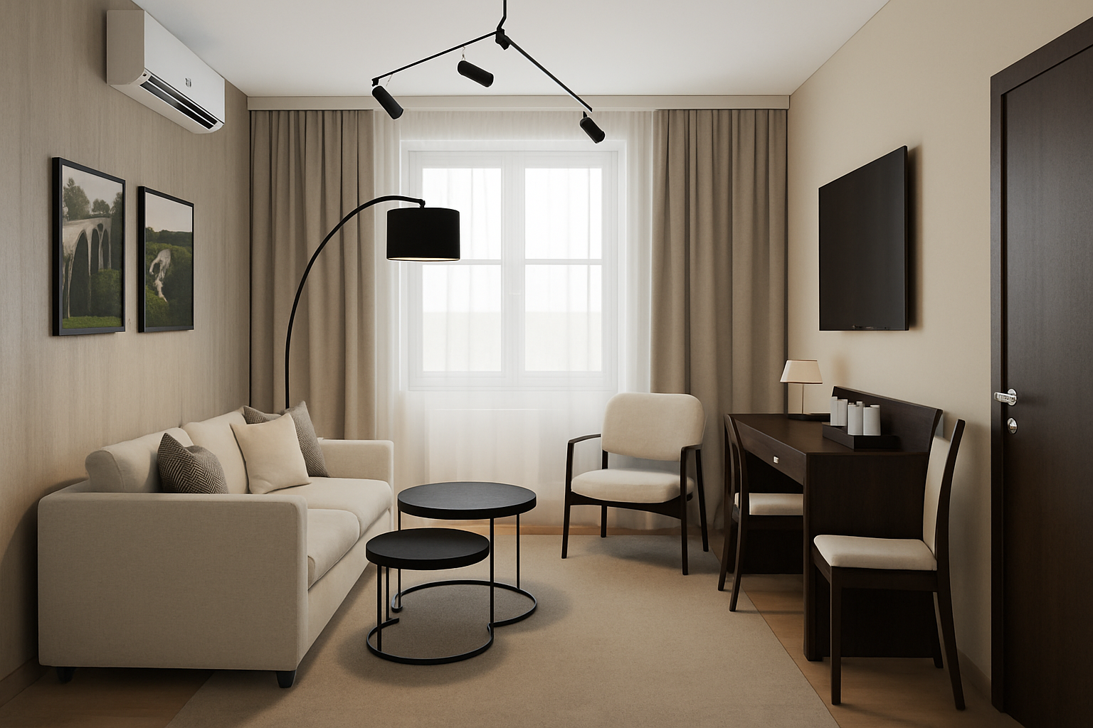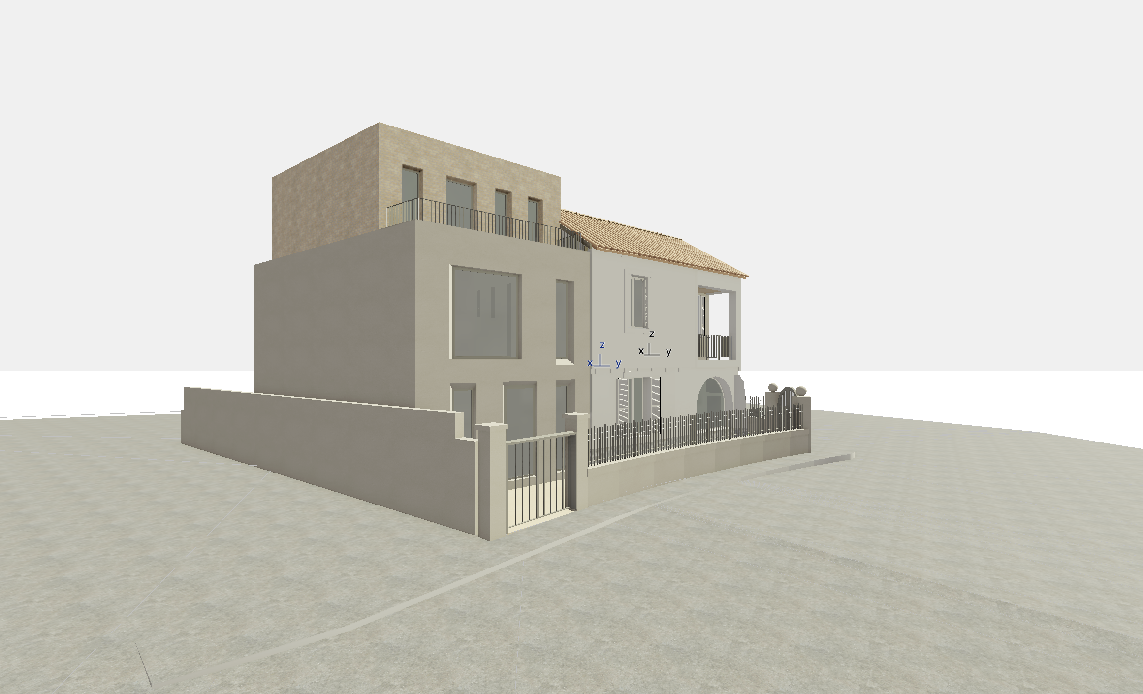 lot of reflects and sun light the sun illuminates the facade that we see some trees and a street of marseille in the backgroung facade more in the light more reflect all is painted no stone the fence call is beige like the extension more shadows of trees on the facade my point of view the fence and the building on the left are same color the attic is in little beige bricks more realistic view the house on the right is more white