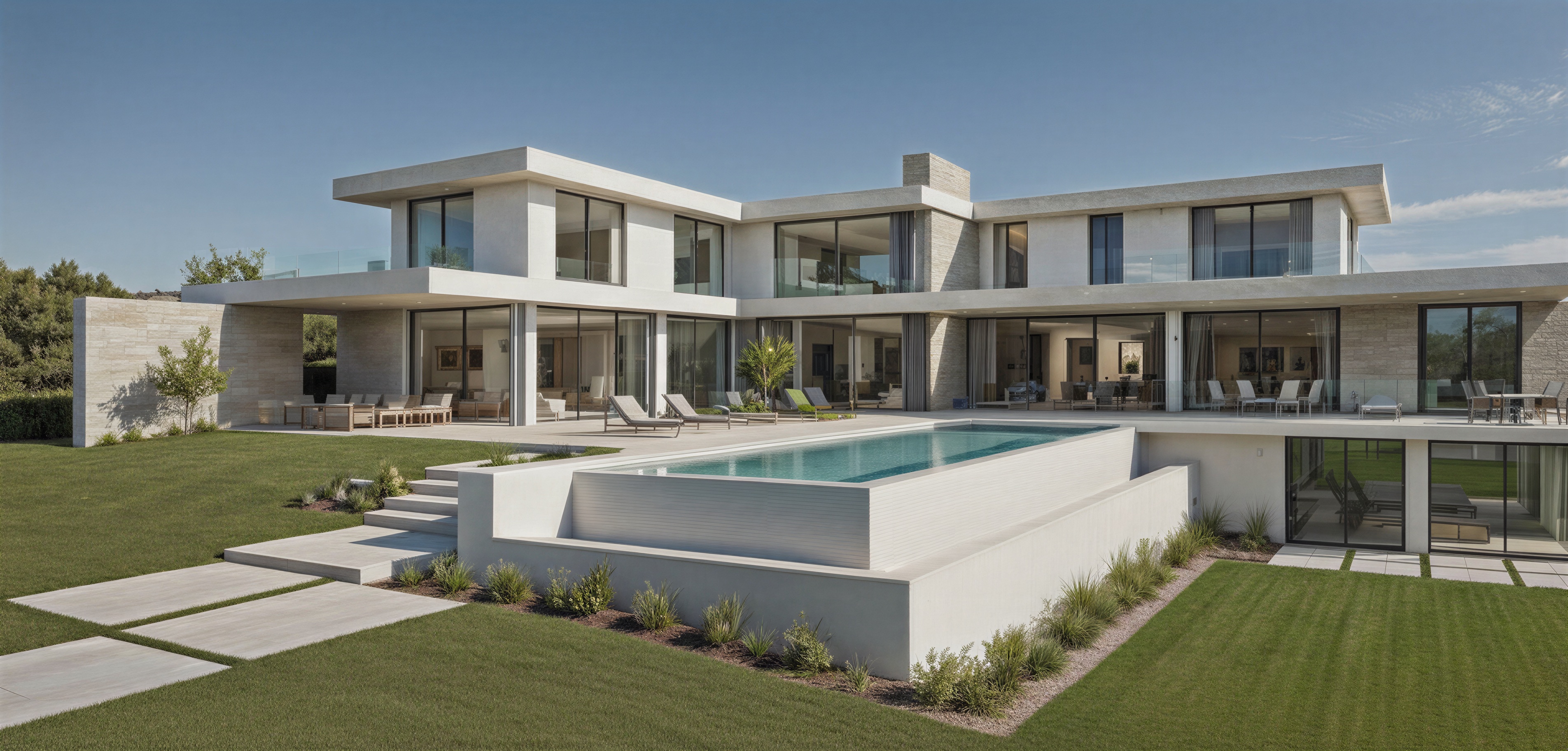 render using the exact original geometry with zero changes to massing proportions roof shapes floor heights openings terraces or building volumes do not alter or reinterpret any architectural form edge detail add a black thin recessed or expressed edge band along the visible edges of the two top main slabs this is a material finish detail only not a geometry change it should read as a clean continuous black shadow line or metal trim emphasizing the top of the slab openings and use clarification on pool fa ade the first two bays from the right are an open outdoor passage do not add sliding doors or glazing keep this as a covered open air circulation zone the next two bays to the left are an recessed niche used as an outdoor bbq area this is not an interior room render it as a shaded recessed outdoor space with built in bbq counter and outdoor kitchen elements pool instruction keep the existing pool shape and position exactly as modeled but render it as an infinity edge pool where water overflows cleanly on one side and cascades visually to the second lower level below no change to pool footprint or walls only water behavior and edge treatment architecture style contemporary luxury villa flat roofs strong horizontal lines layered volumes light beige off white stone or stucco fa ade with subtle horizontal texture black or dark bronze aluminum window frames only where glazing truly exists large floor to ceiling glass only in enclosed spaces deep roof overhangs with sharp clean edges landscape mediterranean style landscaping olive trees cypress trees lavender rosemary thyme ornamental grasses gravel and stone ground covers terracotta and limestone tones drought tolerant species clean but natural layout no tropical plants pool materials light stone or concrete coping calm blue green water realistic reflections visible infinity overflow to lower level lighting soft natural daylight warm climate feel clear or lightly hazy sky realistic sun angle rendering style ultra photorealistic high end architectural photography look global illumination accurate shadows realistic reflections high material detail no stylization camera eye level or slightly elevated wide angle without distortion courtyard and pool in foreground villa as main focus negative prompt no geometry changes no added or removed building volumes no fake doors or windows no closing outdoor areas no changed proportions no tropical landscaping no fantasy style no cartoon no exaggeration no distortion no low detail no sketch