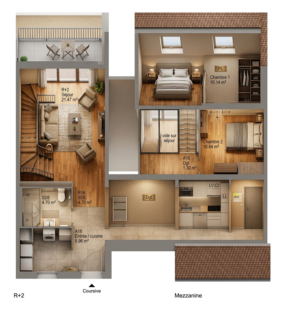 convert this floor plan into a architectural isometric 3d view of a full house show the space from an elevated angle with furniture walls and details visible use the same furniture as shows on the plan do not change the orientation of the floorplan