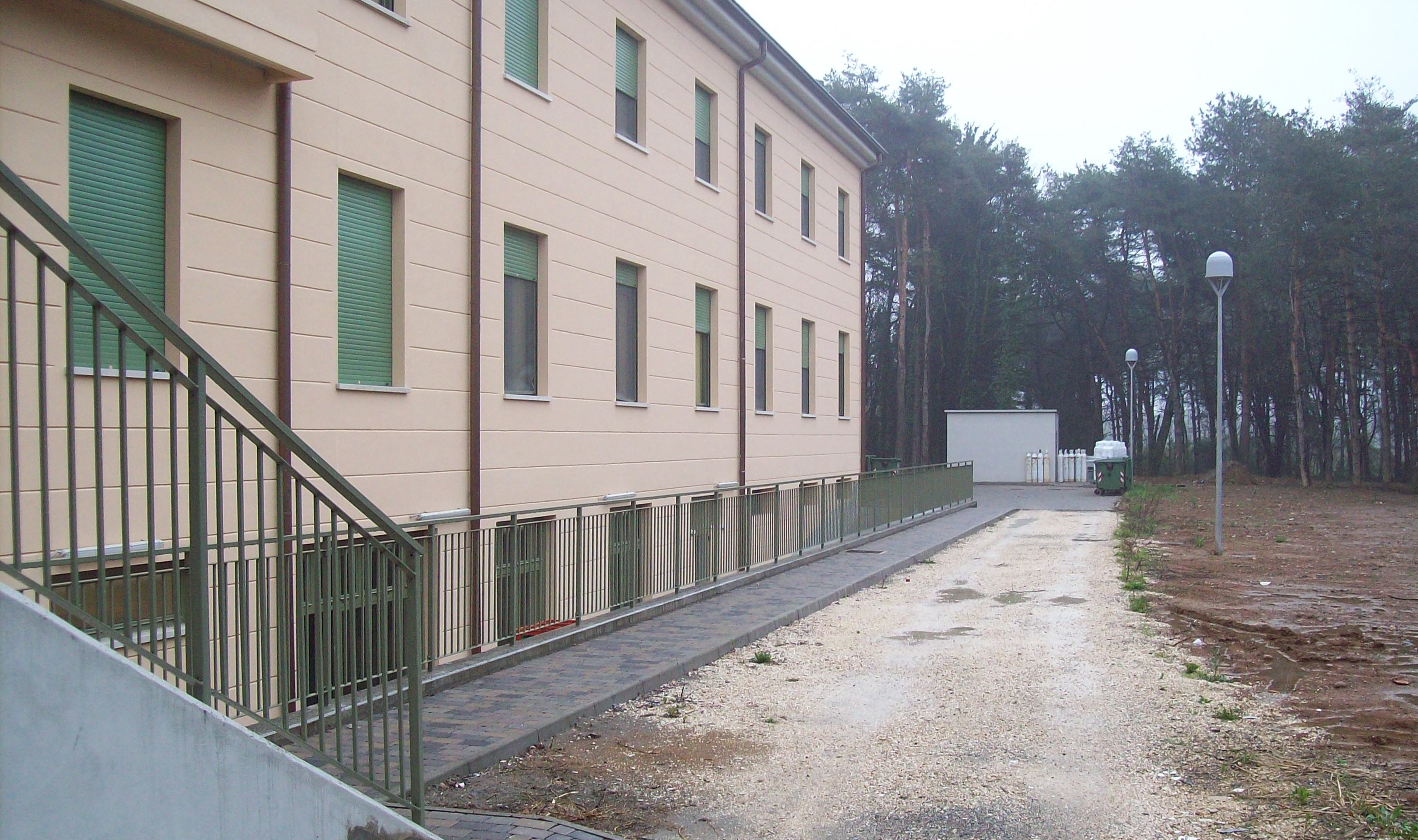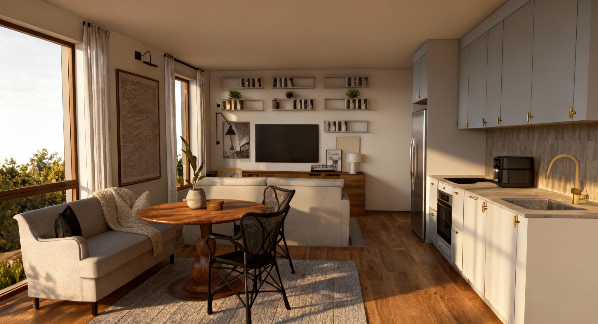 exterior view of a building in a serene autumn setting at evening enhance the outdoor environment making it more beautiful and inviting include a road running alongside the building add a well kept lawn with a few trees featuring autumn foliage in warm colors orange red yellow include natural shrubs and alpine vegetation consistent with the season the scene is at nightfall with soft warm lighting from street lamps and interior windows illuminating the building road and landscaped areas add subtle highlights and gentle reflections on leaves grass and paths to enhance depth and realism emphasize cinematic composition with layered foreground midground and background soft shadows and atmospheric lighting that conveys a cozy cheerful and serene autumn evening high quality realistic rendering rich textures natural light behavior and harmonious integration with the building