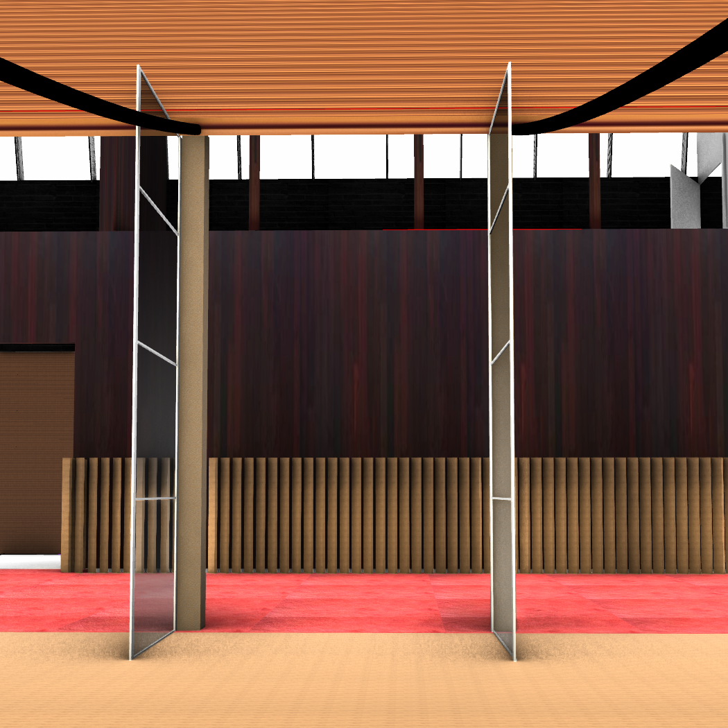 this is a render of the walsh street house by robin boyd the project renovates the house into a mosque keeping the essence of robin boyd within the house the upstairs area is a women s prayer area add some muslim women in prayer facing the wall add some gold arabic caligraphy running horizontally on the wall add some sunlight showing the sunrise coming in from the glass doors architecture