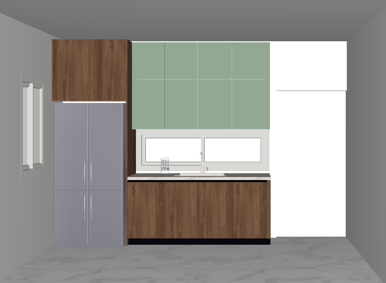 a modern kitchen with minimalist design featuring sleek beige cabinets and black handles the countertops are a rich dark wood adding warmth and contrast include a stainless steel mixer and small potted plants for a touch of greenery the tall pantry cabinet is a light oak wood enhancing the natural feel the floor is a polished light gray marble creating a luxurious atmosphere a large window with wooden blinds allows soft natural light to flood the space casting gentle shadows the walls are a subtle dove gray complementing the overall neutral palette with a calm welcoming ambiance