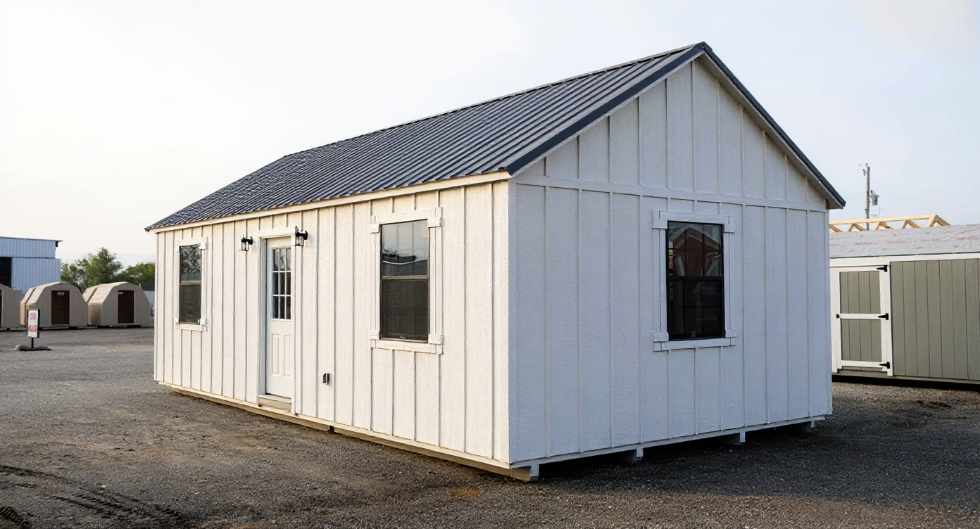 horizontal boards in woodtone lap siding and the remainder black board and batten