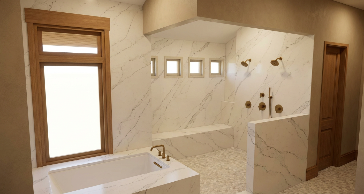 make this image more realistic preserving composition and architecture correct the stone cladding only where it already exists do not add new stone areas keep the rest of the fa ade as white stucco ensure natural well scaled stone with clean joints and no deformation keep the pool clearly defined not confused with grass maintain the mother and children naturally integrated natural light balanced colors no plastic look