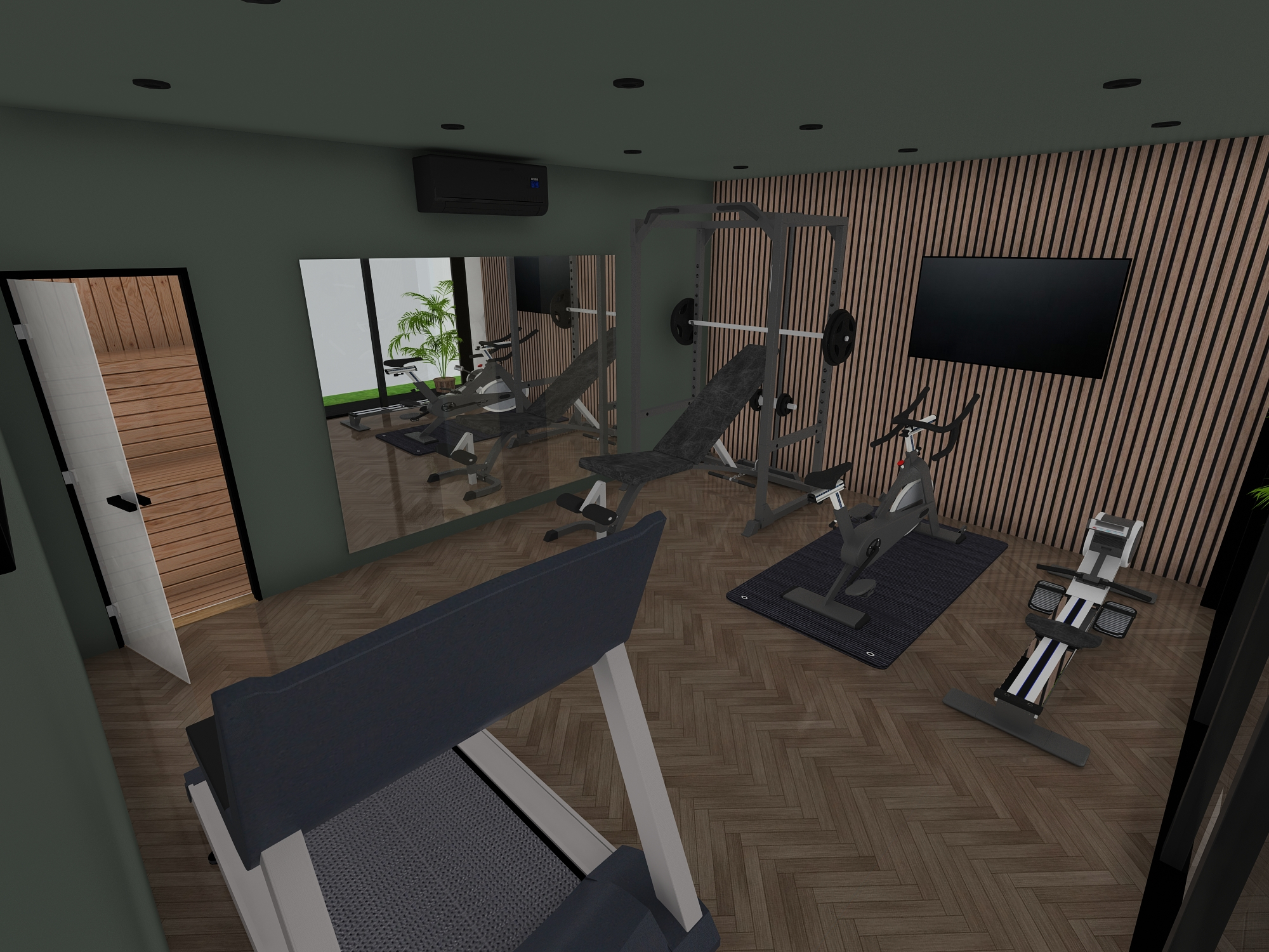 paint the walls in farrow ball studio green add warm white led strip lighting around the mirror and warm white led lighting above and below the wooden slatted feature wall reduce the height of the slatted feature wall so it sits approximately 100mm above the floor and 100mm below the ceiling