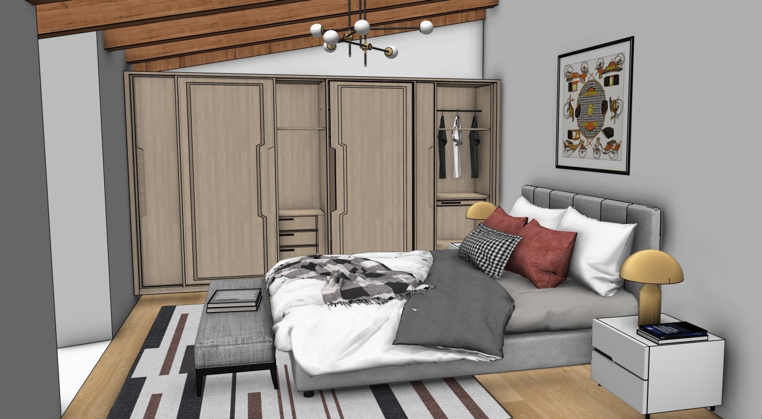 blue pllows marble tiles on the floor white wardrobe the wall behind the bed should be pink