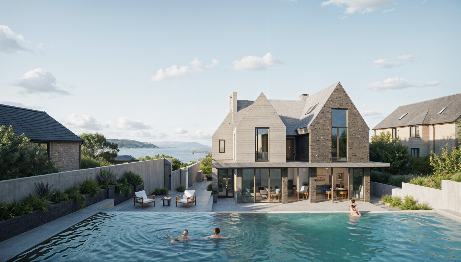 convert the scene to early evening at sunset blue hour in barcelona the sky is deep blue with remaining soft ambient daylight creating balanced natural illumination increase overall scene brightness slightly while preserving evening atmosphere natural ambient light from the sky softly illuminates the courtyard improving visibility of architecture materials and people warm architectural lighting 2700k 3000k from building interiors pavilion pathway lights and table lamps creates gentle warm accents but does not overpower the natural ambient light ensure the courtyard remains clearly visible with realistic light balance between cool ambient sky light and warm artificial lighting photorealistic architectural visualization calm evening coworking atmosphere realistic reflections soft shadows professional architectural photography dezeen and archdaily style