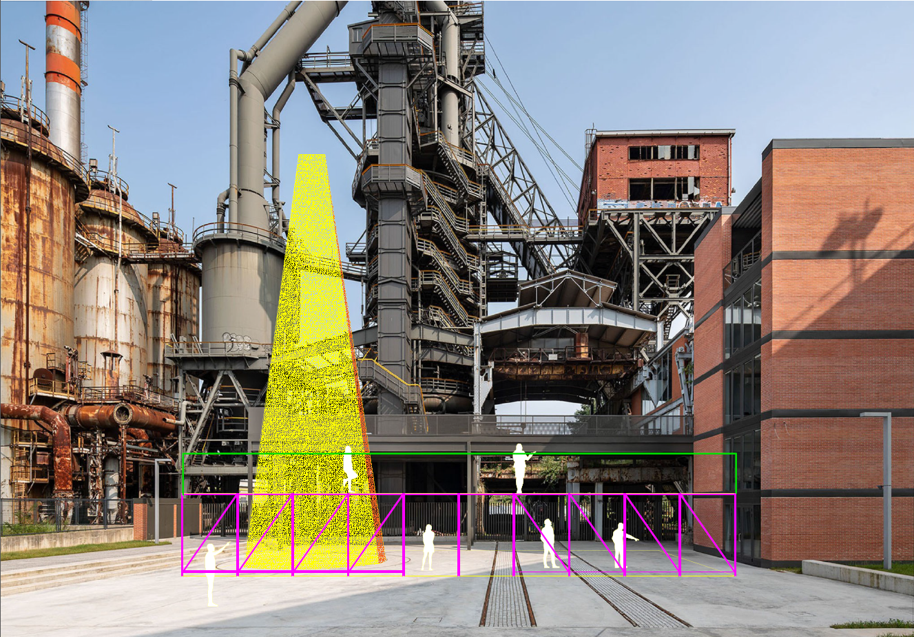 quiero que en ese fondo introduzcas segun las lineas que ves la misma forma que es un proyecto de arquitectura efimera lo amarillo es como un gran cono telar blanco que funciona como el centro del proyecto y luego lo violeta es la estructura de la planta baja del proyecto que vendrian siendo andamios y luego en verde pon una barandilla para que la gente no se caiga de la primera planta del proyecto introduce una forma de andamios a la barandilla