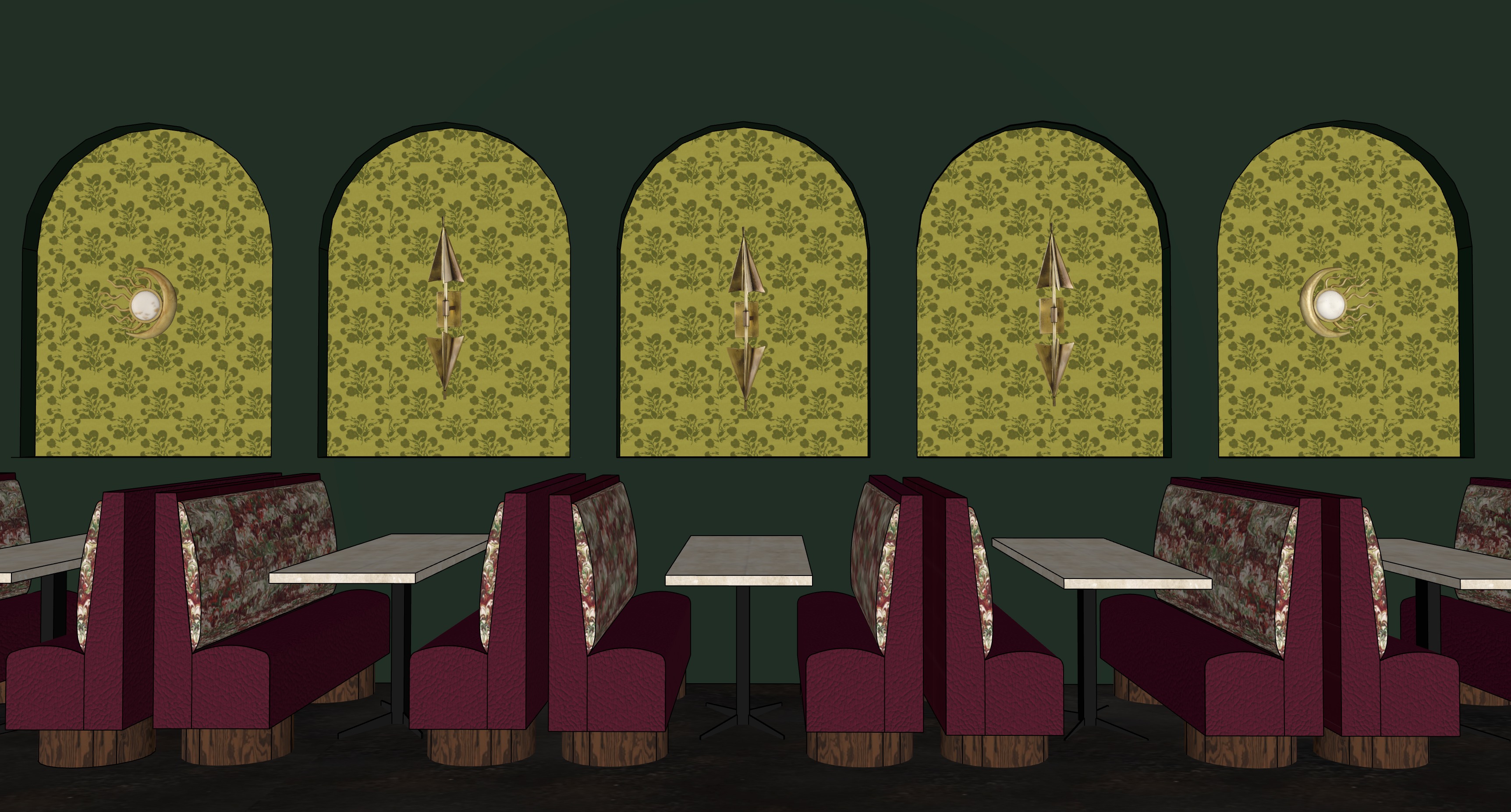 ultra photorealistic professional interior photography of a high end spanish inspired restaurant banquette seating area deep forest green plaster walls with recessed arched alcoves containing vintage yellow green floral wallpaper warm brass wall sconces centered in each arch alternating between sculptural elongated cone sconces and frosted globe sconces emitting soft warm 2700k ambient light with realistic glow and falloff custom upholstered banquette seating in rich burgundy textured fabric with subtle weave detail and slight natural creasing backrests feature inset floral patterned upholstery panels with realistic fabric depth and stitching banquette base constructed of dark stained oak wood plinth with visible wood grain texture and matte satin finish tables are solid honed travertine stone tops with natural pores tonal variation and slightly eased edges supported by matte black steel pedestal bases with subtle wear and soft reflections floor is dark polished concrete with realistic micro texture subtle reflectivity and natural imperfections lighting is cinematic and layered soft indirect ambient lighting warm accent lighting from sconces subtle bounce light and gentle shadow gradients physically accurate global illumination ray traced reflections ambient occlusion and contact shadows camera perspective is straight on eye level interior architectural photography 35mm lens perfectly symmetrical composition shallow depth of field but overall sharp focus professional hospitality photography editorial quality ultra high resolution extremely detailed textures realistic materials natural imperfections filmic color grading style references high end hospitality interior photography boutique luxury restaurant architectural digest professional commercial interior shoot render settings photorealistic ray tracing global illumination physically accurate lighting ultra detailed 8k resolution cinematic lighting sharp focus realistic materials no stylization no illustration no cgi look