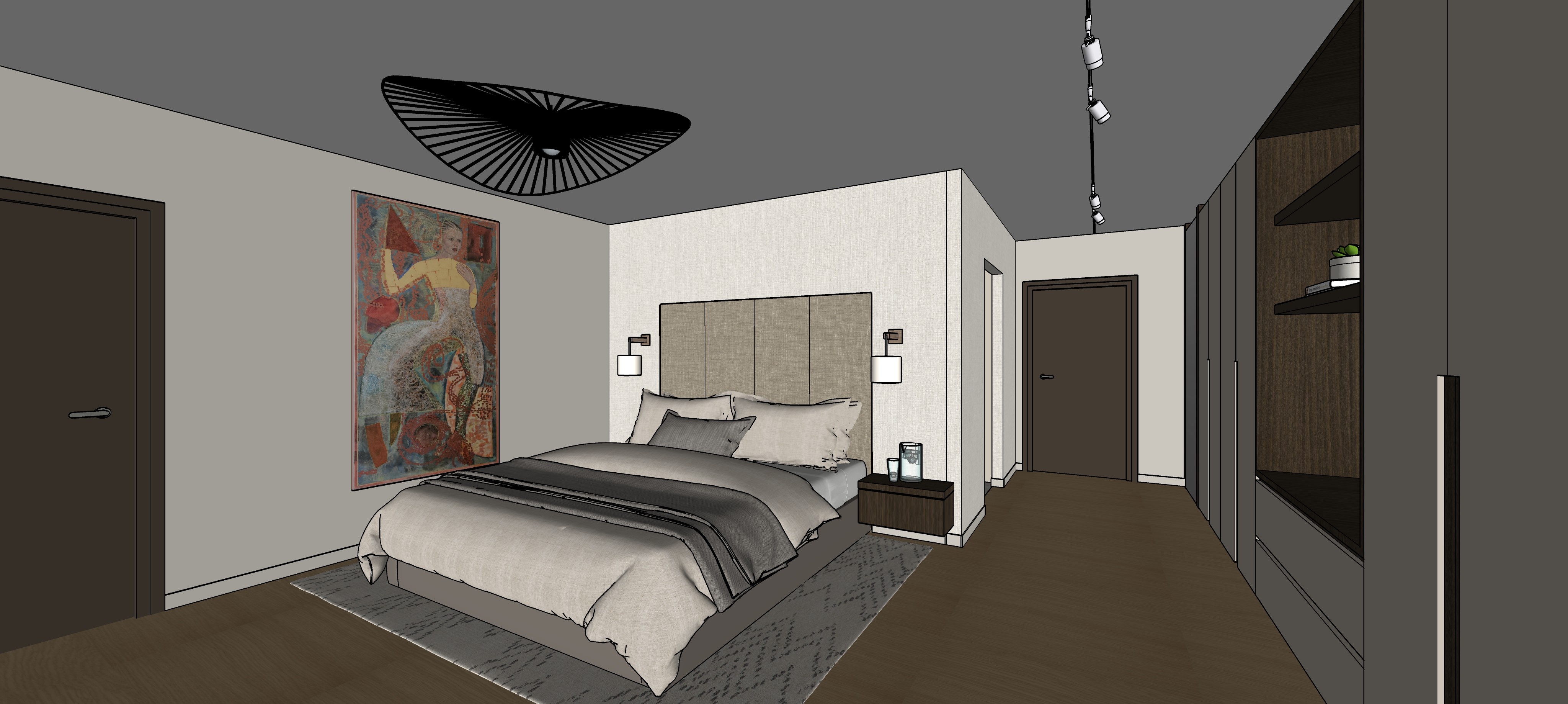 photorealistic interior architectural visualization of a luxury bedroom floor showing long thin wooden floor planks with visible grooves light oak finish with a subtle warm orange yellow undertone rubio monocoat mist style minimalist grain walls painted in a soft muted beige sikkens f6 03 72 featuring a focal wall behind the bed with arte washed white wallpaper showing a delicate tactile texture cabinetry custom floor to ceiling wardrobes with doors in a light beige matte finish little greene portland stone dark 157 the cabinets feature integrated open shelving and accents in a deep dark brown wood with a greyish undertone rubio monocoat heel grey smooth texture without visible grooves perfectly seamless furniture matching nightstands in the same dark heel grey wood doors internal doors finished in a rich earthy taupe little greene elysian ground 320 lighting natural daylight soft shadows high end interior design photography style 8k resolution clean lines
