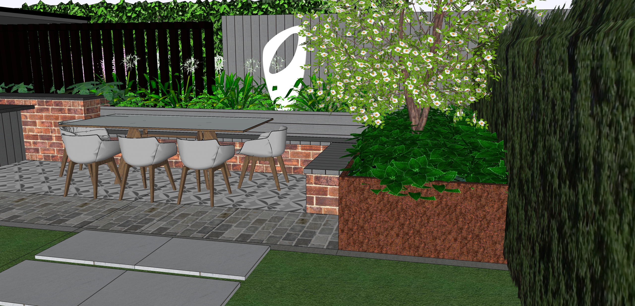 sandstone setts porcelain pattern paving sandstone flags in lawn large rusted corten steel planter with evergreen planting and tree white sculpture in raised bed seating with brick base and grey timber top and back rest timber fence in the background with large laurel hedge row of black l shape arches
