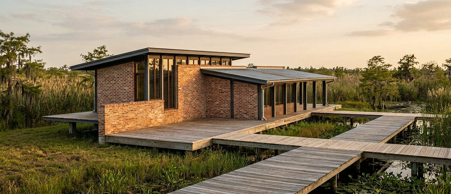 brick walls with steel structure glass and a metal roof set in the marshes of south louisiana