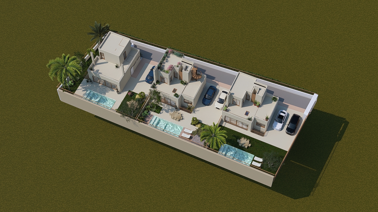 imagen a rea vista de dron de una zona residencial en el lateral derecho de la parcela se encuentra una calle bien definida con trazado claro y ordenado el resto del terreno est dividido en parcelas residenciales amplias donde se ubican chalets de distintos estilos arquitect nicos modernos contempor neos y tradicionales las viviendas son grandes y espaciosas con dise os variados rodeadas de abundante vegetaci n rboles jardines cuidados setos que aportan privacidad y un entorno natural muchas de las parcelas cuentan con piscinas privadas visibles desde la vista a rea con agua clara y reflejos realistas la composici n debe mostrar un urbanismo ordenado pero diverso con caminos accesos y distribuci n coherente iluminaci n natural estilo mediterr neo luz solar equilibrada cielo parcialmente despejado alta calidad fotorrealista estilo render arquitect nico o fotograf a de dron profesional gran nivel de detalle texturas realistas y sensaci n de zona residencial exclusiva
