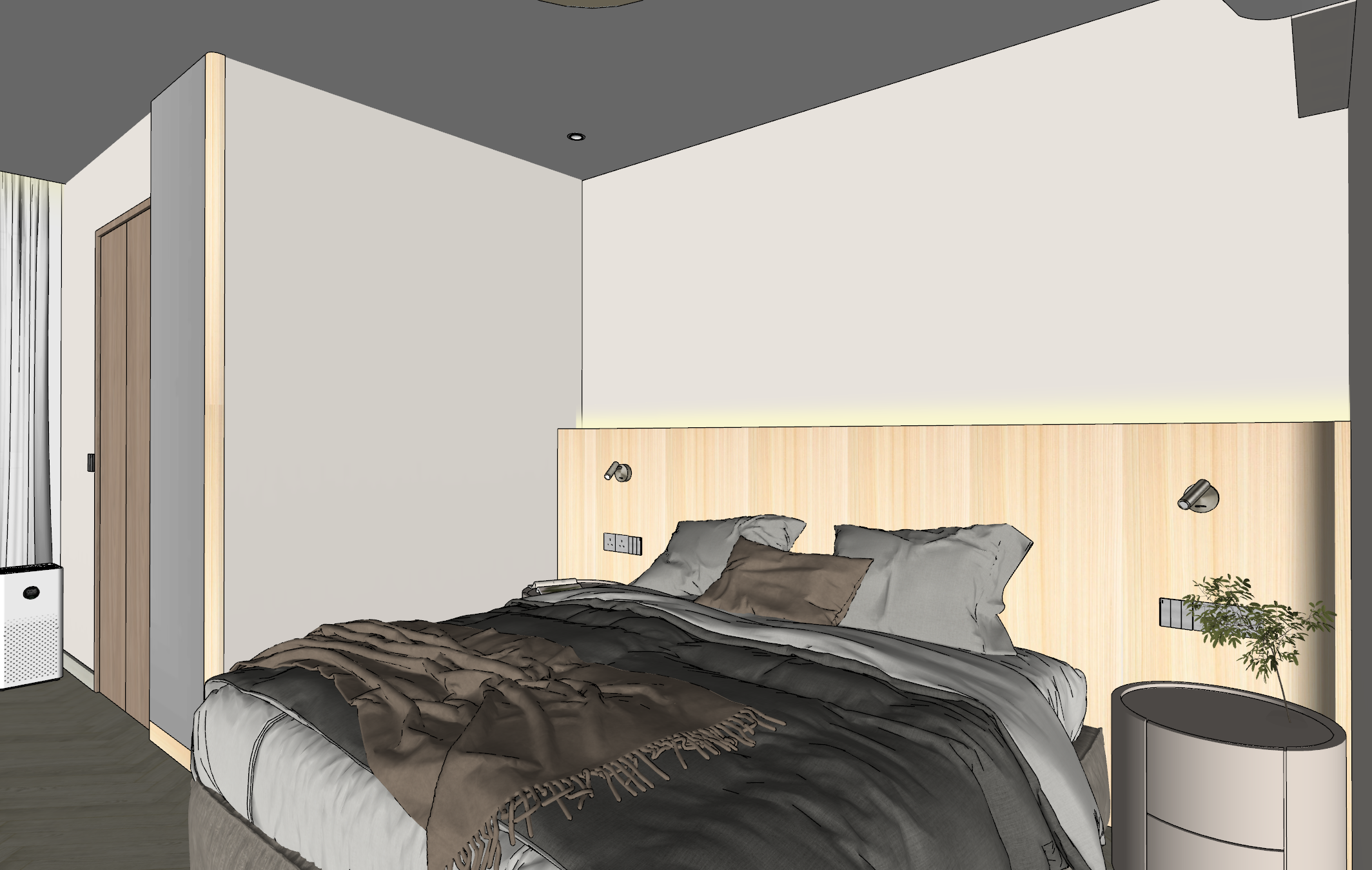 bedframe headboard is using japanese hinoki cypress woodgrain in vertical the ceiling comes with recessed downlights and make the overall vibes brighter room window is at left