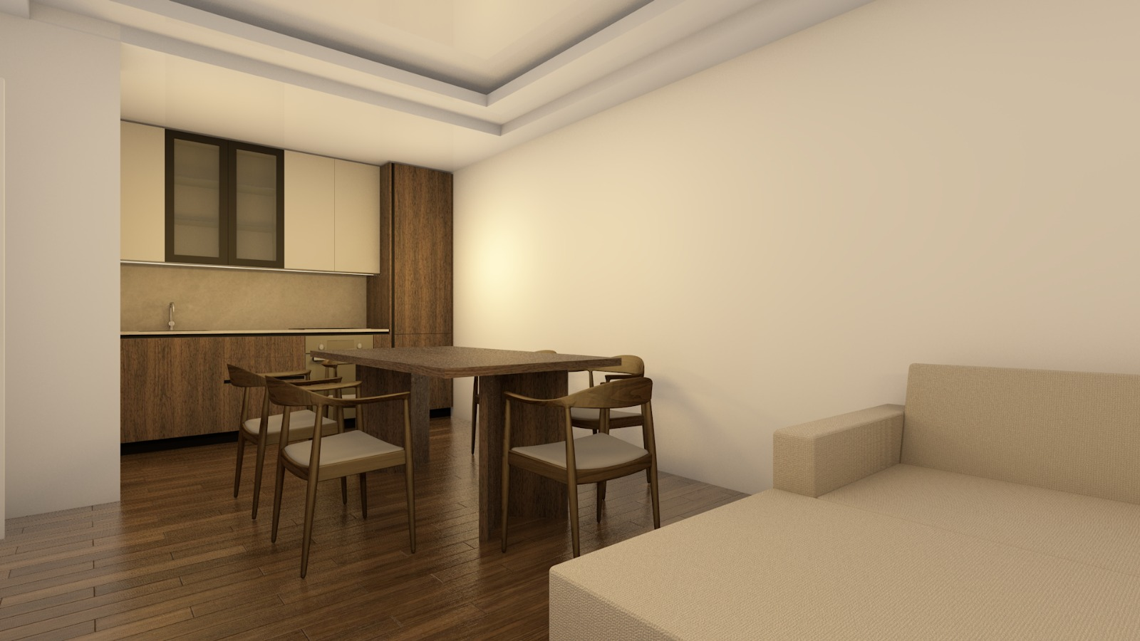 a modern kitchen with walnut cabinetry and beige tones featuring a beige marble countertop and backsplash with subtle veining add a stylish dining table matching the walnut and beige theme with elegant chairs place a soft textured rug under the dining table include detailed kitchen decorations such as ceramic vases wooden trays a fruit bowl glass jars and warm ambient lighting under cabinet led keep it clean but lived in and cozy