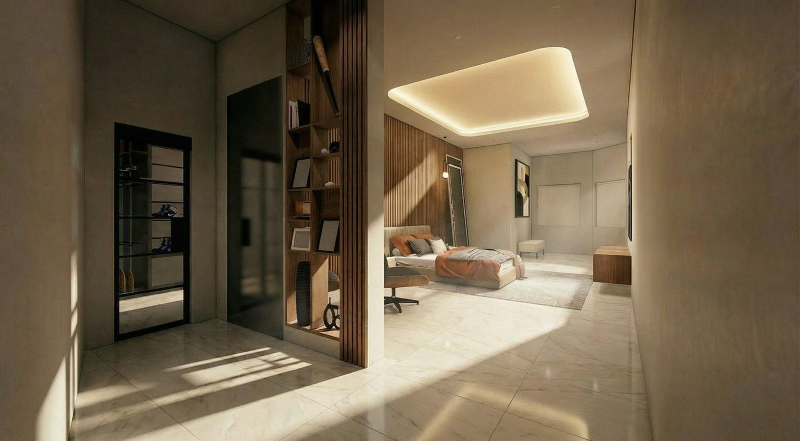 the design must strictly follow and be based on the provided sketchup model preserving the exact architectural layout proportions dimensions camera angle and spatial composition from the original project ultra detailed photorealistic 8k resolution cinematic composition volumetric lighting high dynamic range architectural visualization quality add natural lighting and soft shadows change floor to taj mahal quartzite tiles