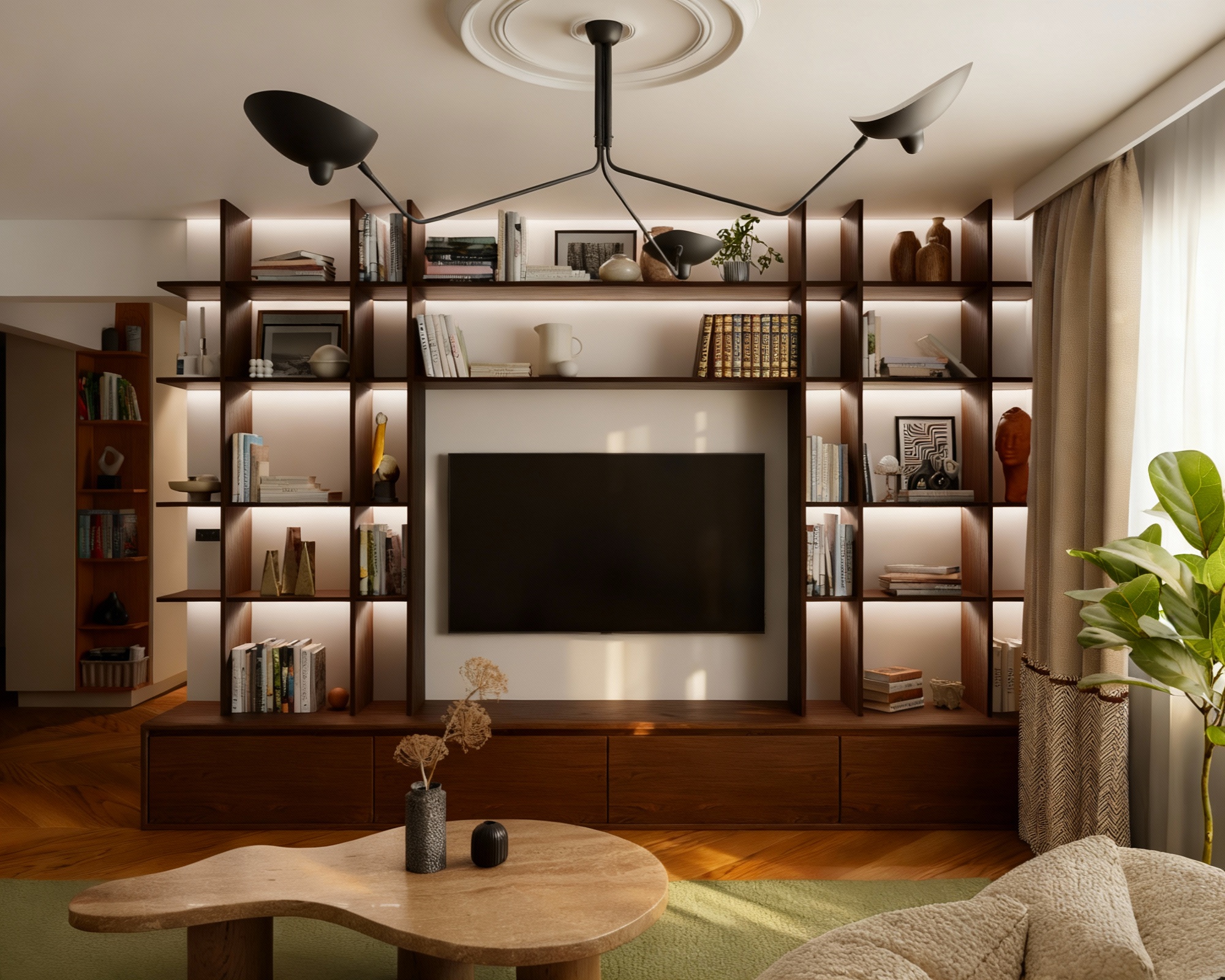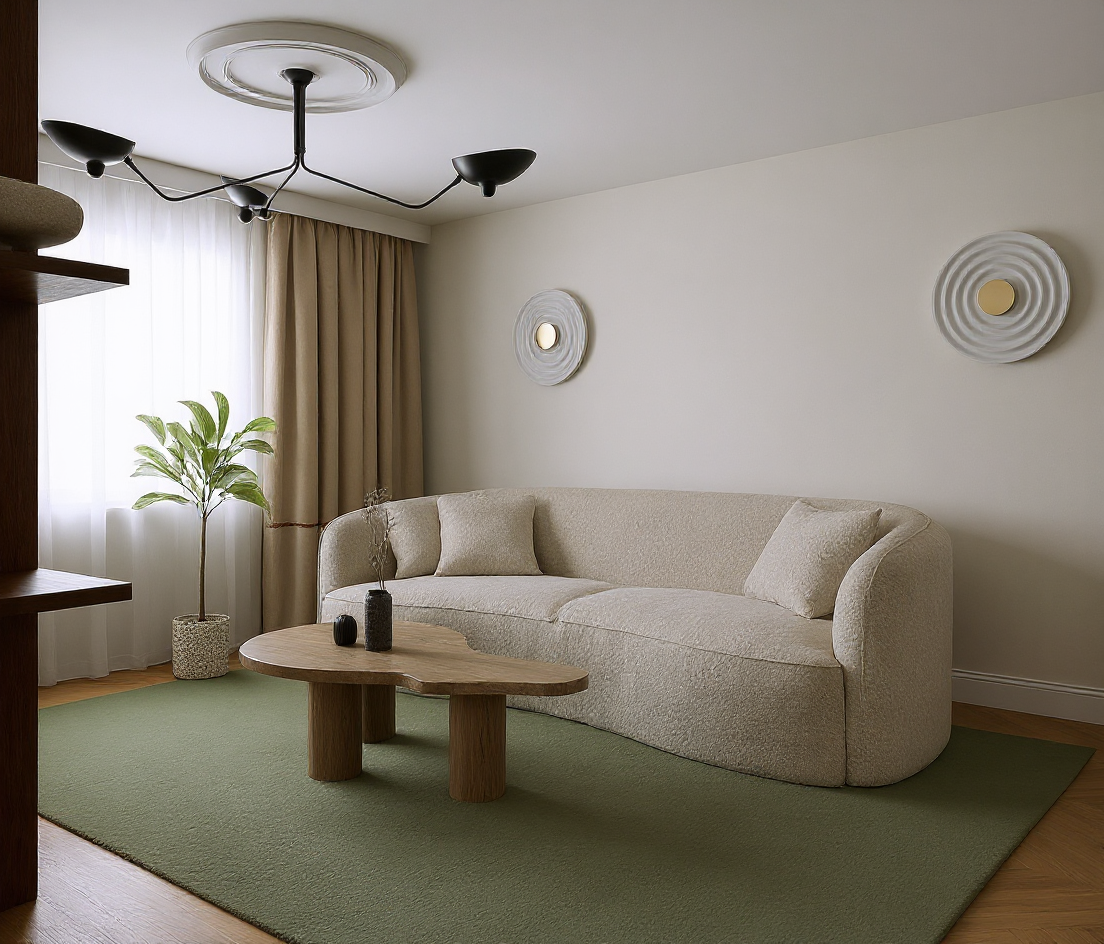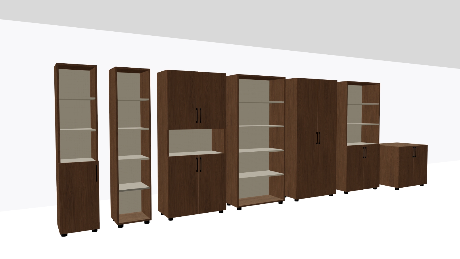 from the visible sketch make a photorealistic photo of the furniture that is visible do not change the shapes or heights of the furniture change the light sand color to a dark blue wooden color change the handles in the furniture to light wooden handles replace them with large semi circular handles keep all the details and proportions of the furniture