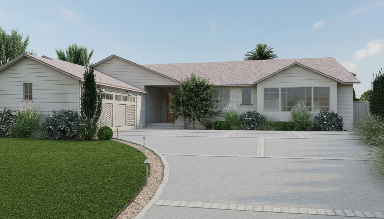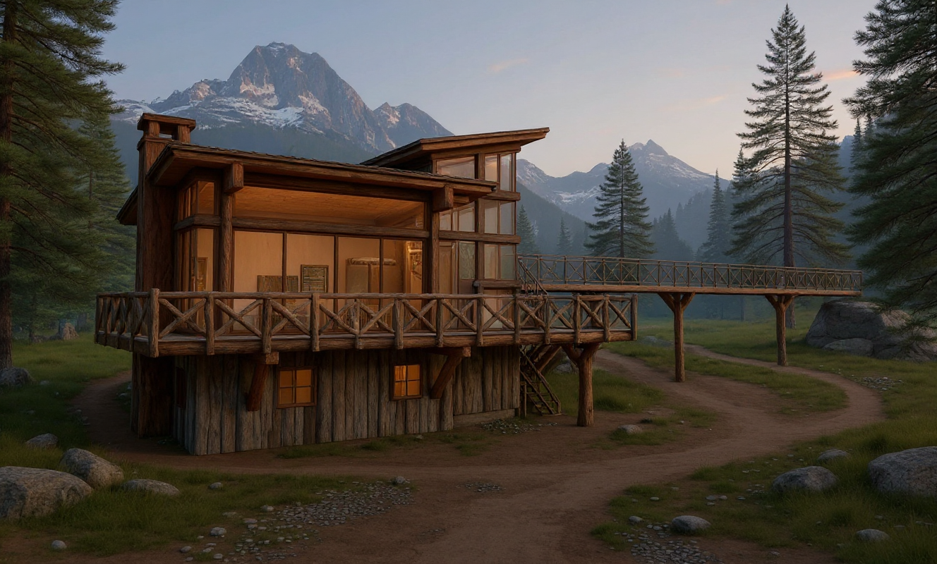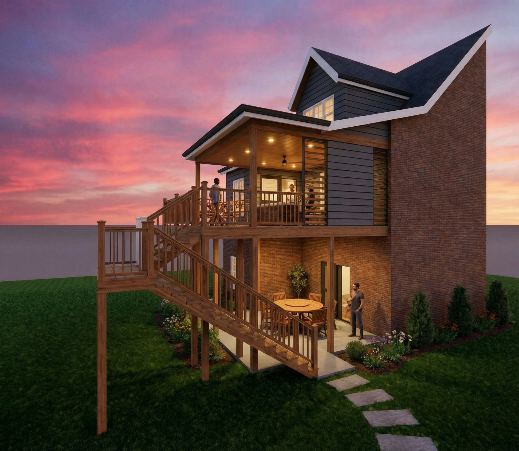 add grass and landscaping afternoon sky with pink and purple hues add simple ceiling lights at porch ceilings on both levels add large round table under lower level of porch add people on both levels make stair railings and posts stained wood color