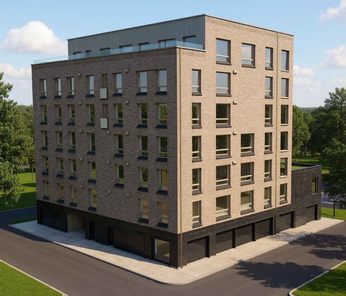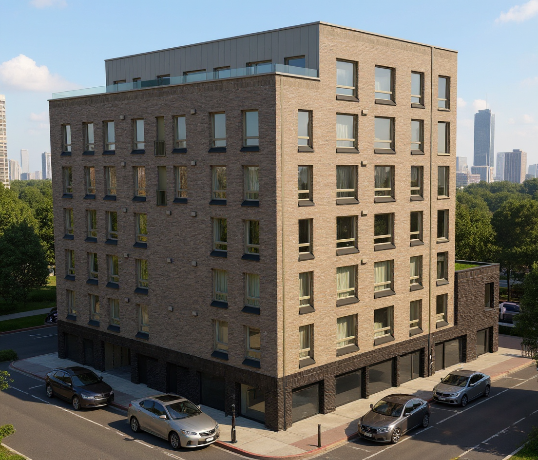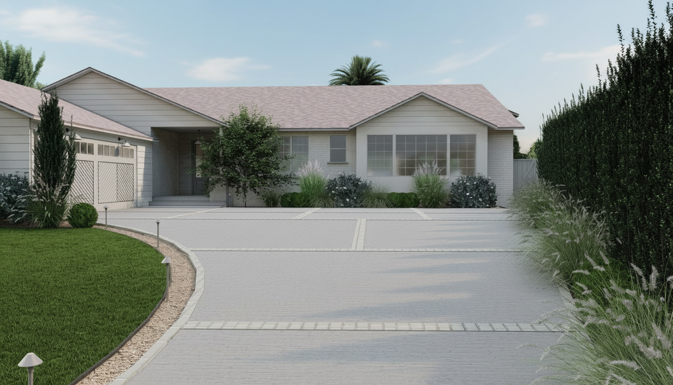add grass and landscaping afternoon sky with pink and purple hues add simple ceiling lights at porch ceilings on both levels add large round table under lower level of porch add people on both levels make stair railings and posts stained wood color
