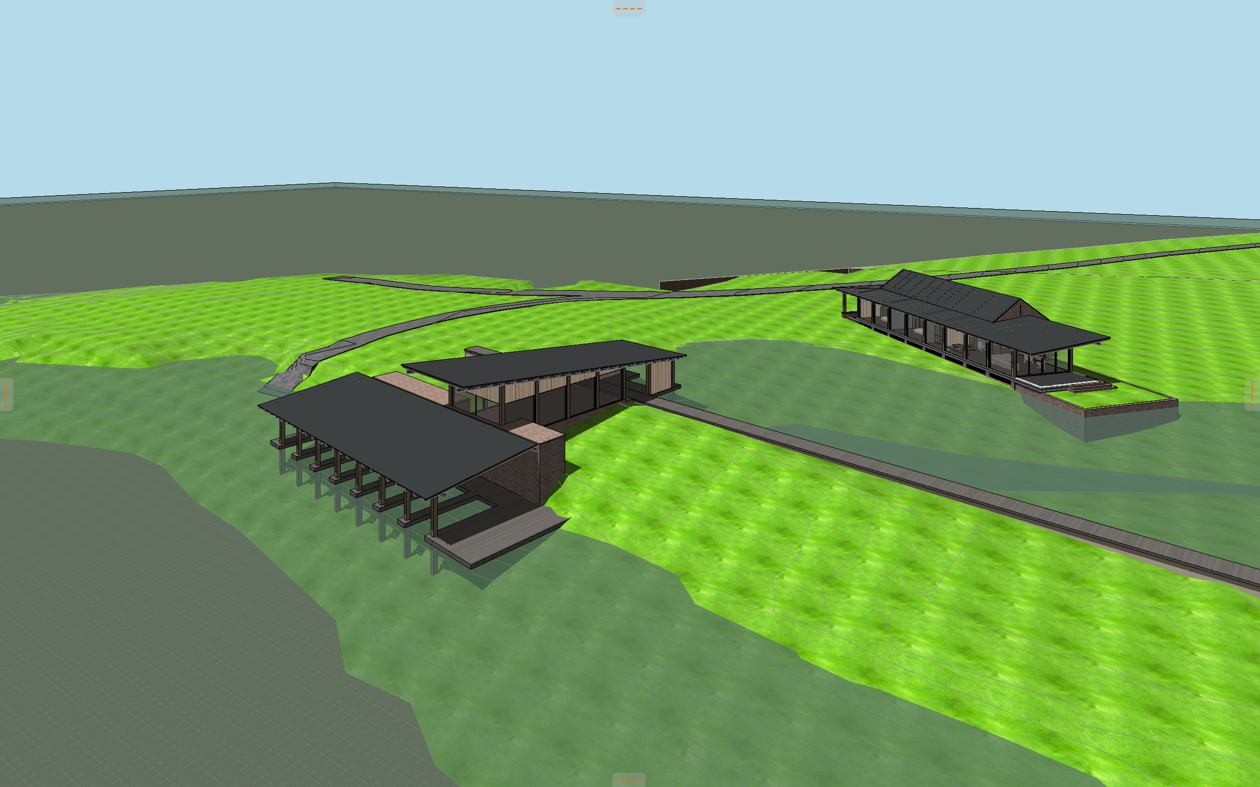 detail shot of an antique brick house with a soldier course at the top of brick walls with timber columns steel beams reclaimed pine soffit yellow pine trees in the background clouds in the sky lake inlet in the foreground landscape to be tall wild louisiana grasses a large group of people swimming in the water people on kayaks bass boats in boat slips and a bass boat driving to the boat slips