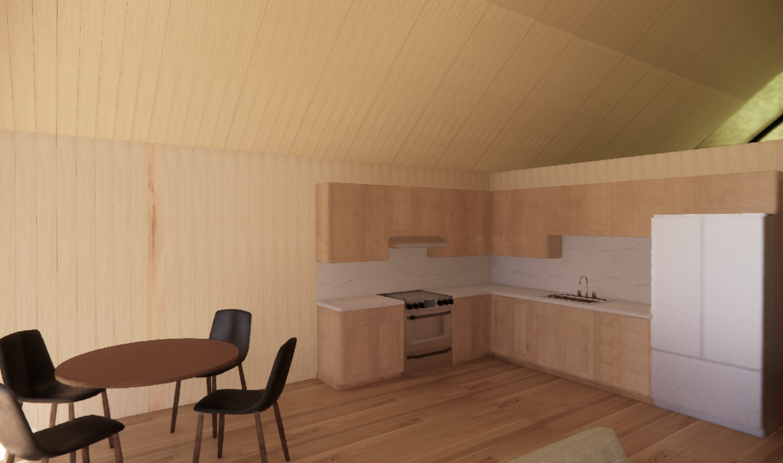 all walls and ceilings to be a uniform light pine wood cladding make refrigerator look more realistic