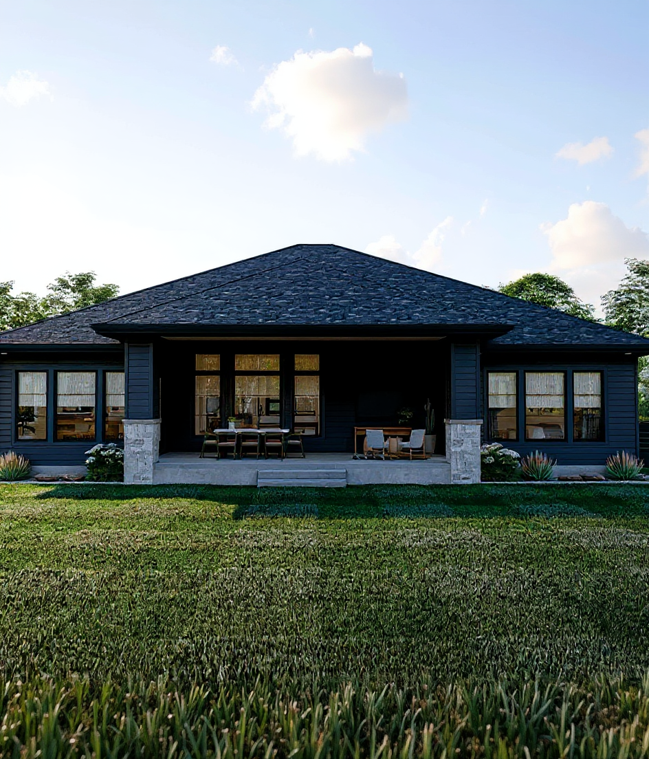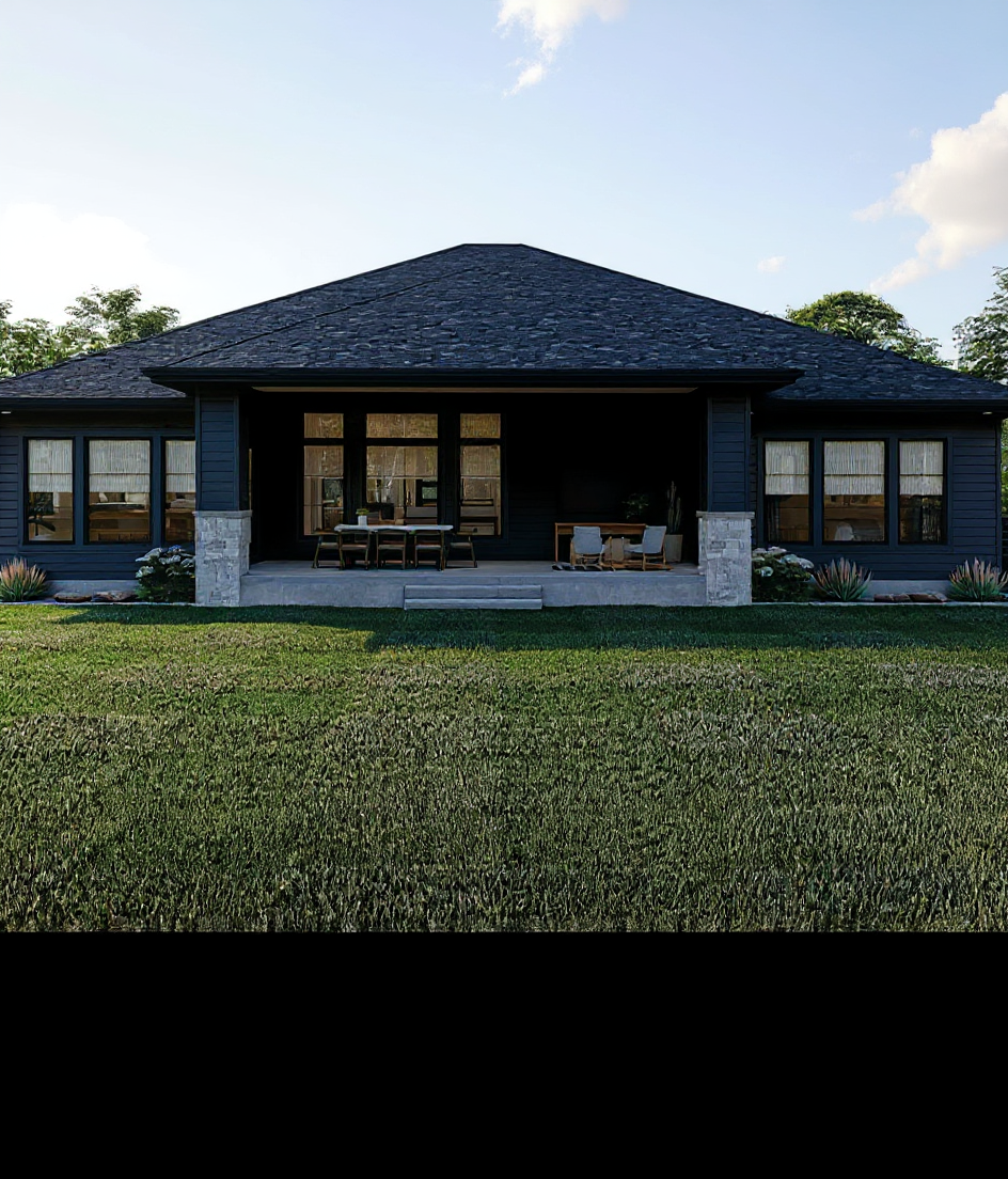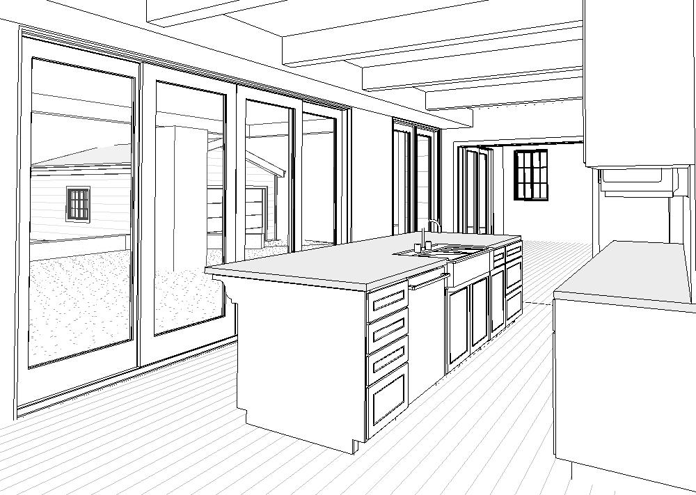 a photorealistic high resolution interior rendering of a modern farmhouse kitchen designed for architectural showcase retain all existing details white shaker cabinetry white window panes light gray quartz countertops rustic wood beams pendant lighting over a large central island farmhouse sink natural fine grain wood flooring with dark stain emphasize realistic material textures subtle reflections on the countertops soft matte paint finishes on cabinetry natural daylight streams through the windows creating balanced illumination with gentle highlights and shadows the exterior view shows bright sunlight filtering through branches and a lush backdrop of green trees adding depth and realism while maintaining focus on the kitchens clean timeless design and craftsmanship