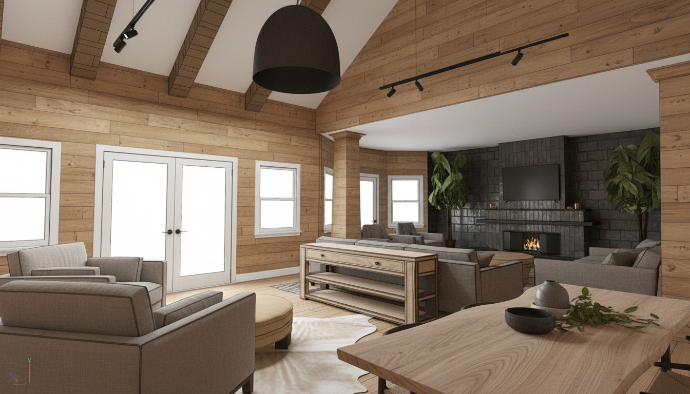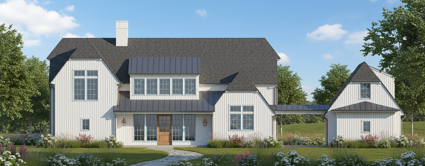 exterior of home with white painted vertical siding grey metal lower roof grey asphalt shingle upper roof white oak front door light blue painted windows copper sconces stone chimeny set in a rural landscape with soft daylight lighting