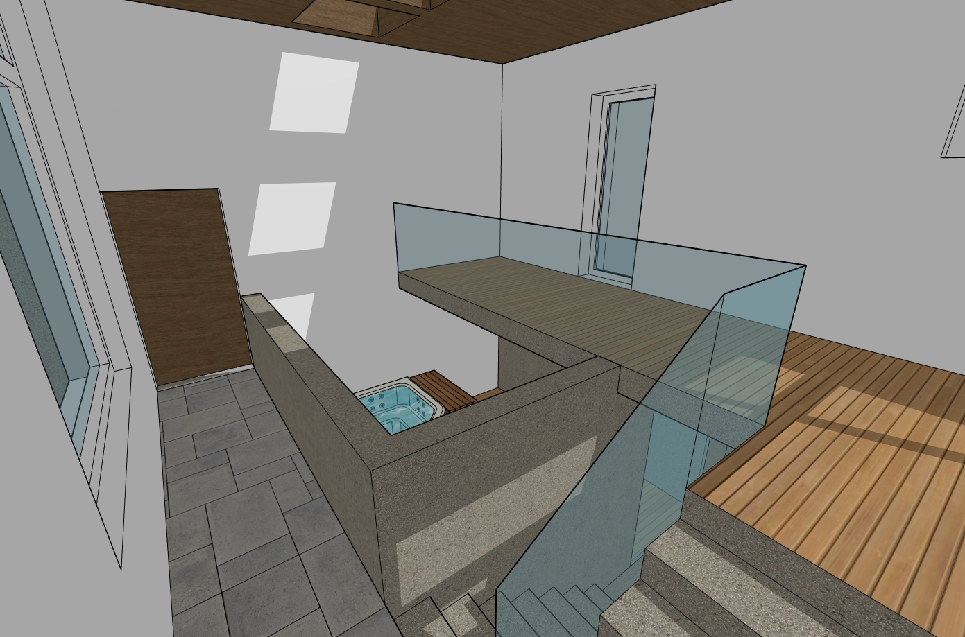 a cosy and relaxing sauna space located between a garage and a house the design integrates natural elements and soft light add lush green plants to bring a touch of nature into the space on the upper level place one person in a relaxed position overlooking the sauna area there is a hole or opening between the upper platform and the corridor from the garage visually connecting the levels natural beautiful light filters in through ceiling windows creating a warm and serene atmosphere the overall design feels modern inviting and tranquil with a harmonious mix of wood glass and greenery
