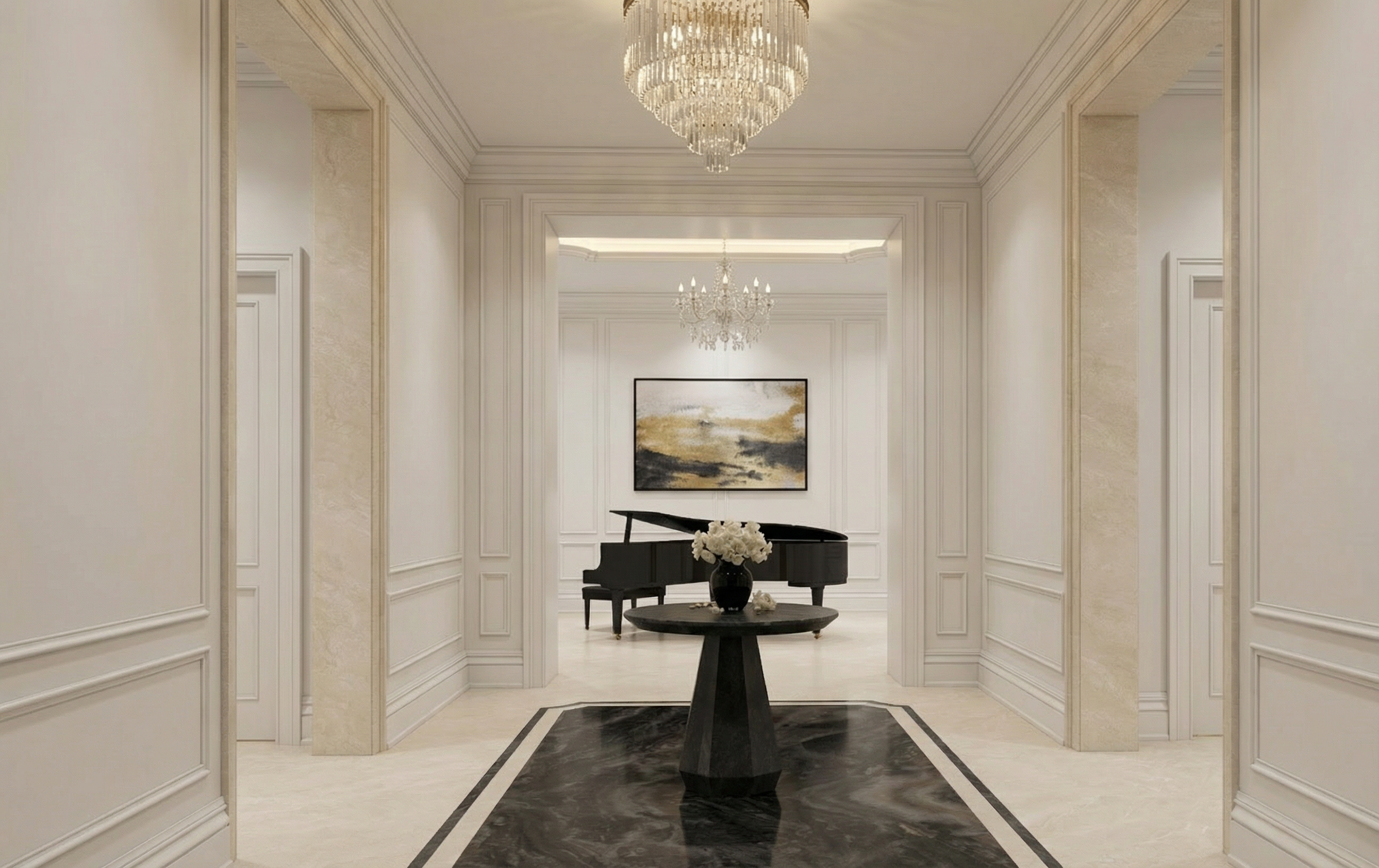 legno rovere leggermente sbiancato le ante degli ascensori sono in vetro nero
